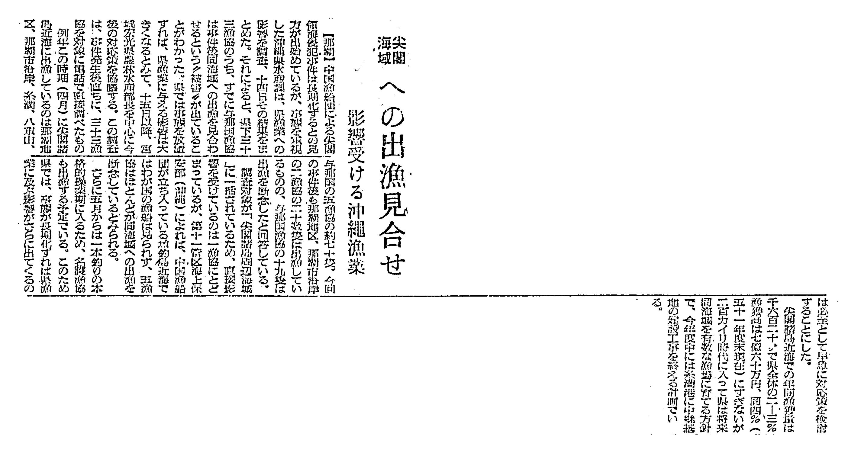 > 尖閣海域への出漁見合わせ/影響受ける沖縄漁業 :