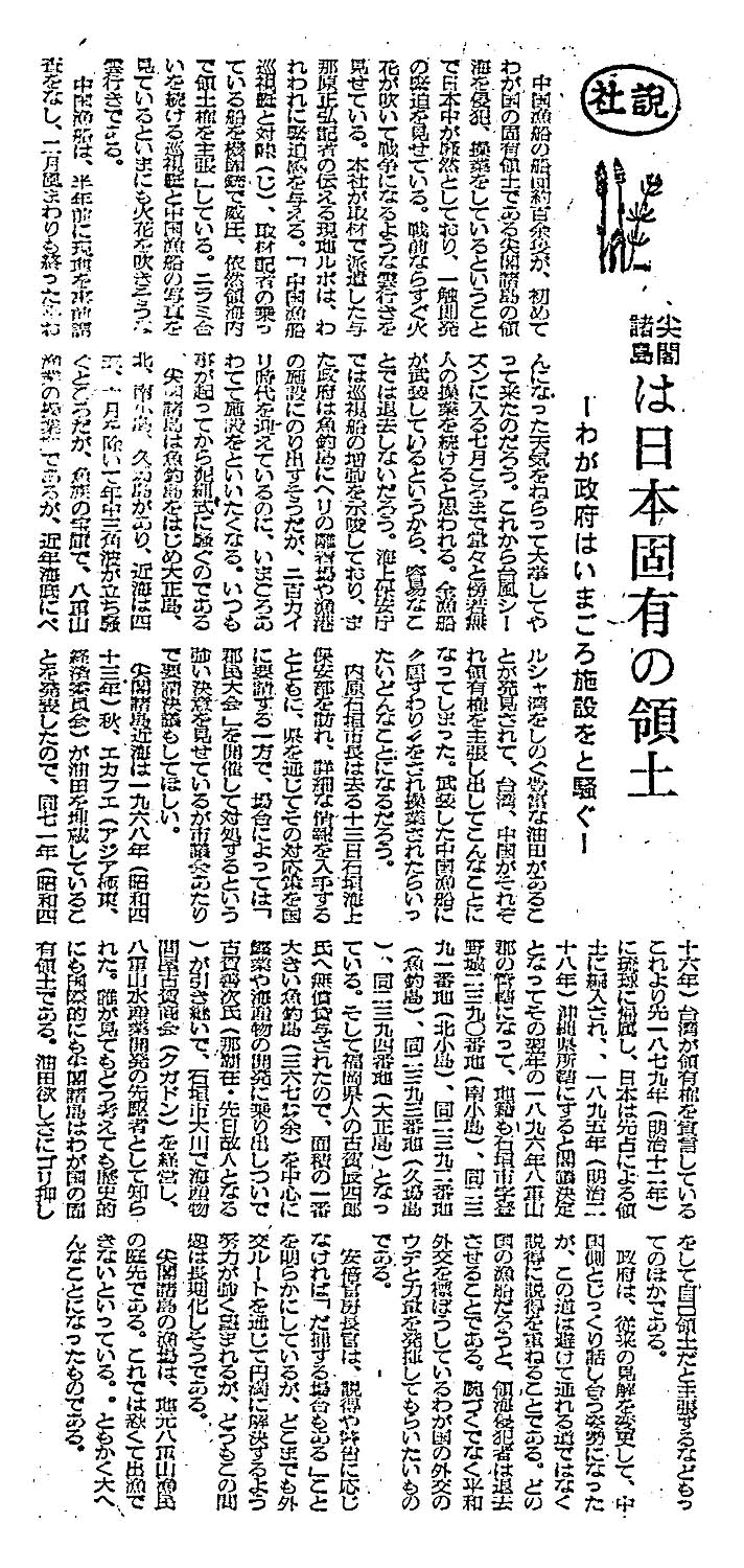 > < 社説 >尖閣諸島は日本固有の領土 -わが政府はいまごろ施設をと騒ぐ-: