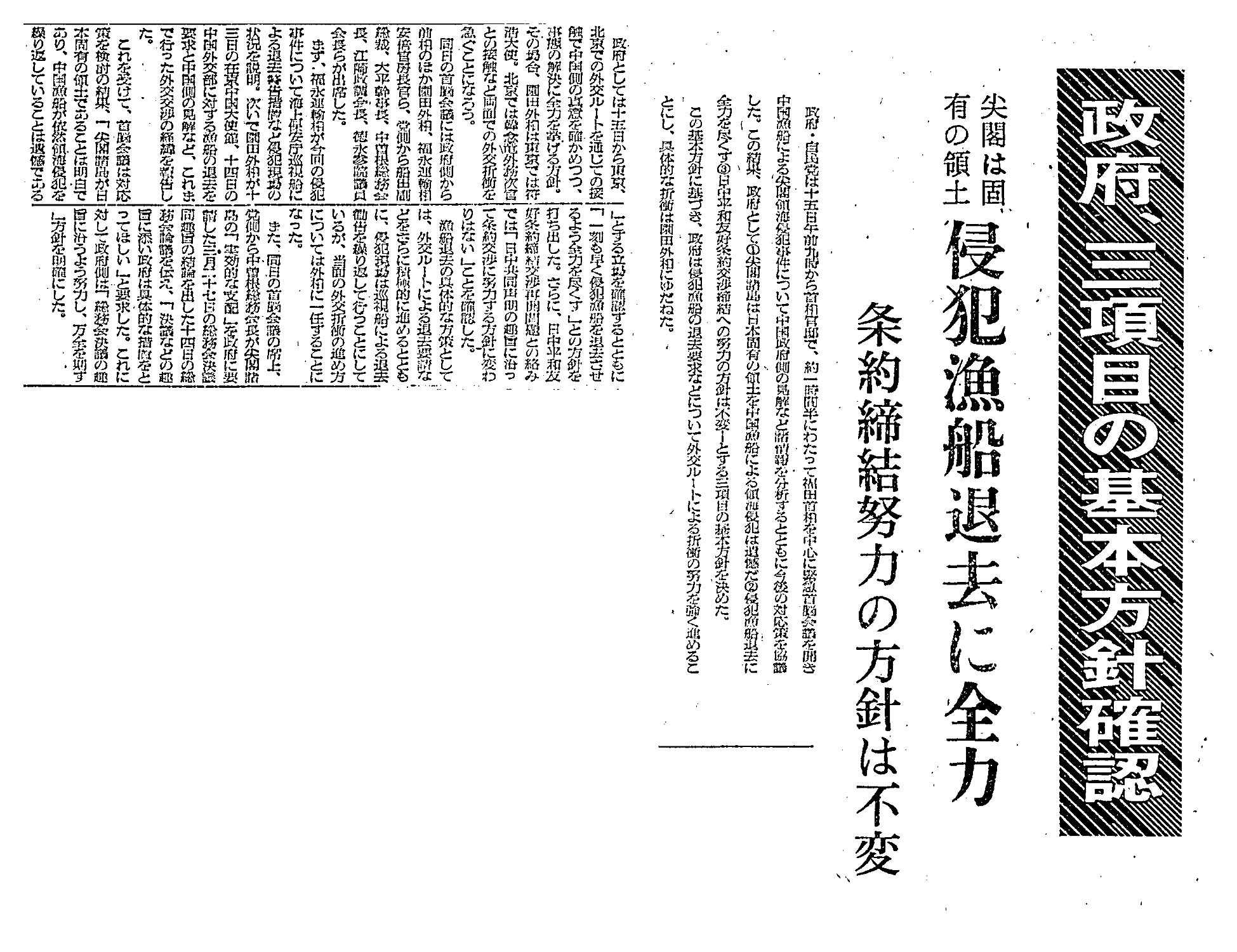 > 政府、三項目の基本方針確認/尖閣は固有の領土/侵犯漁船退去に全力/条約締結努力の方針は不変:
