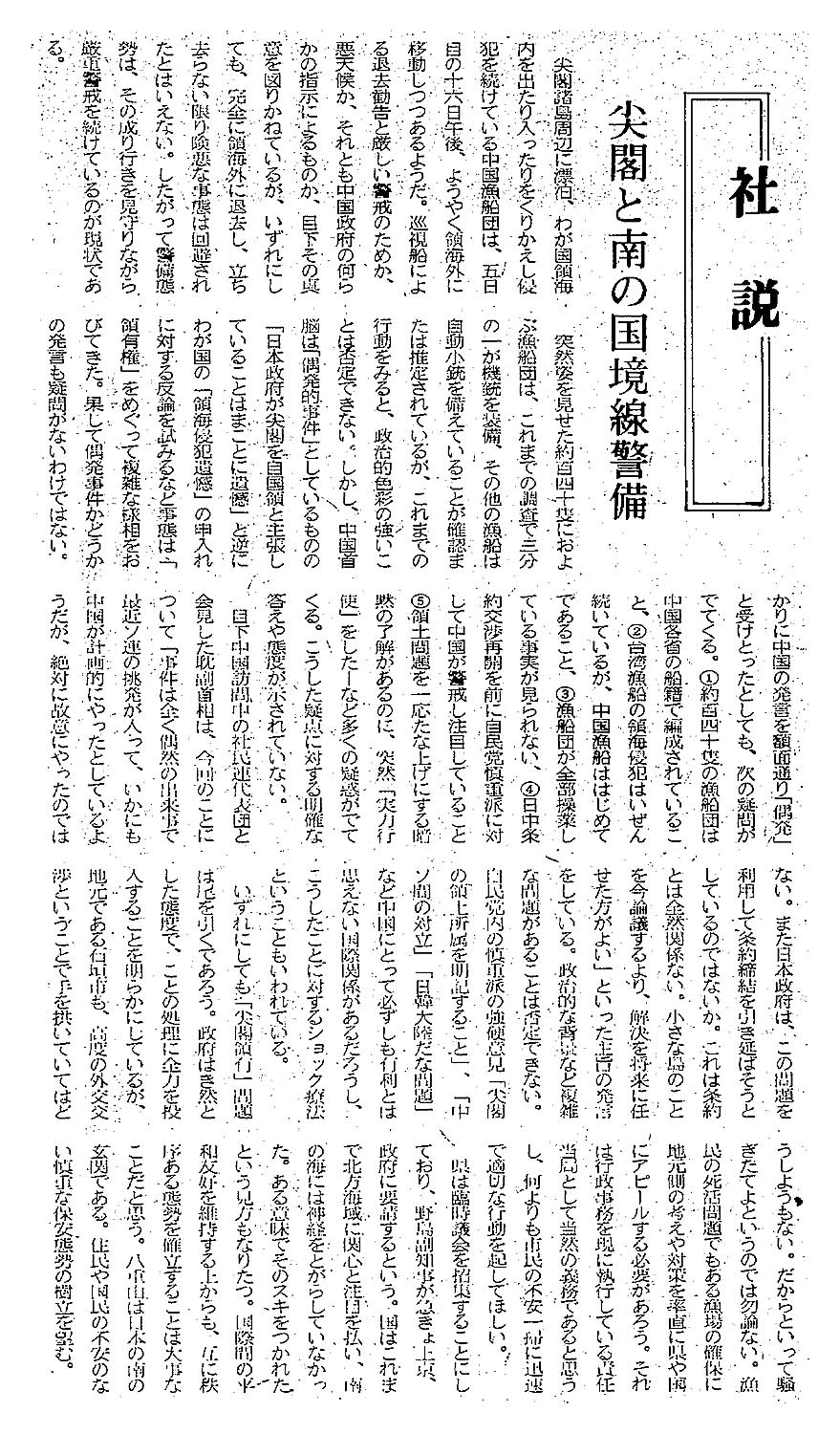 > <社説>尖閣と南の国境線警備: