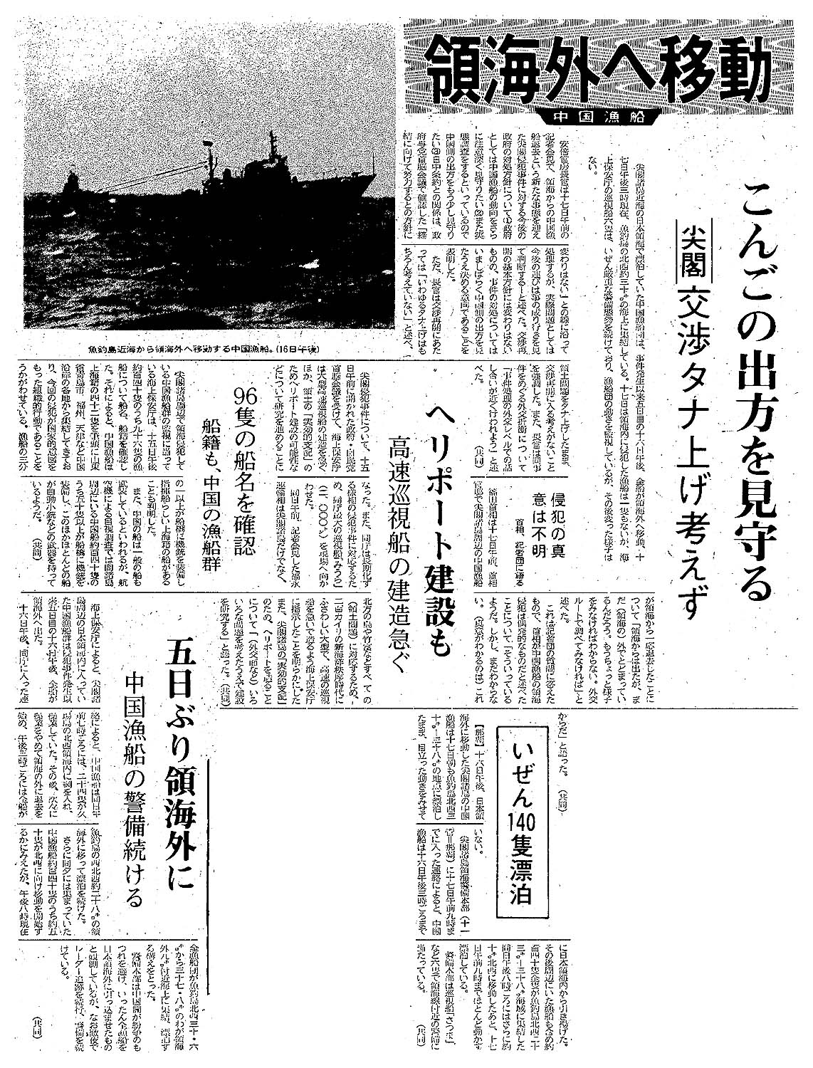 > 領海外へ移動/こんごの出方を見守る/|尖閣|交渉タナ上げ考えず: