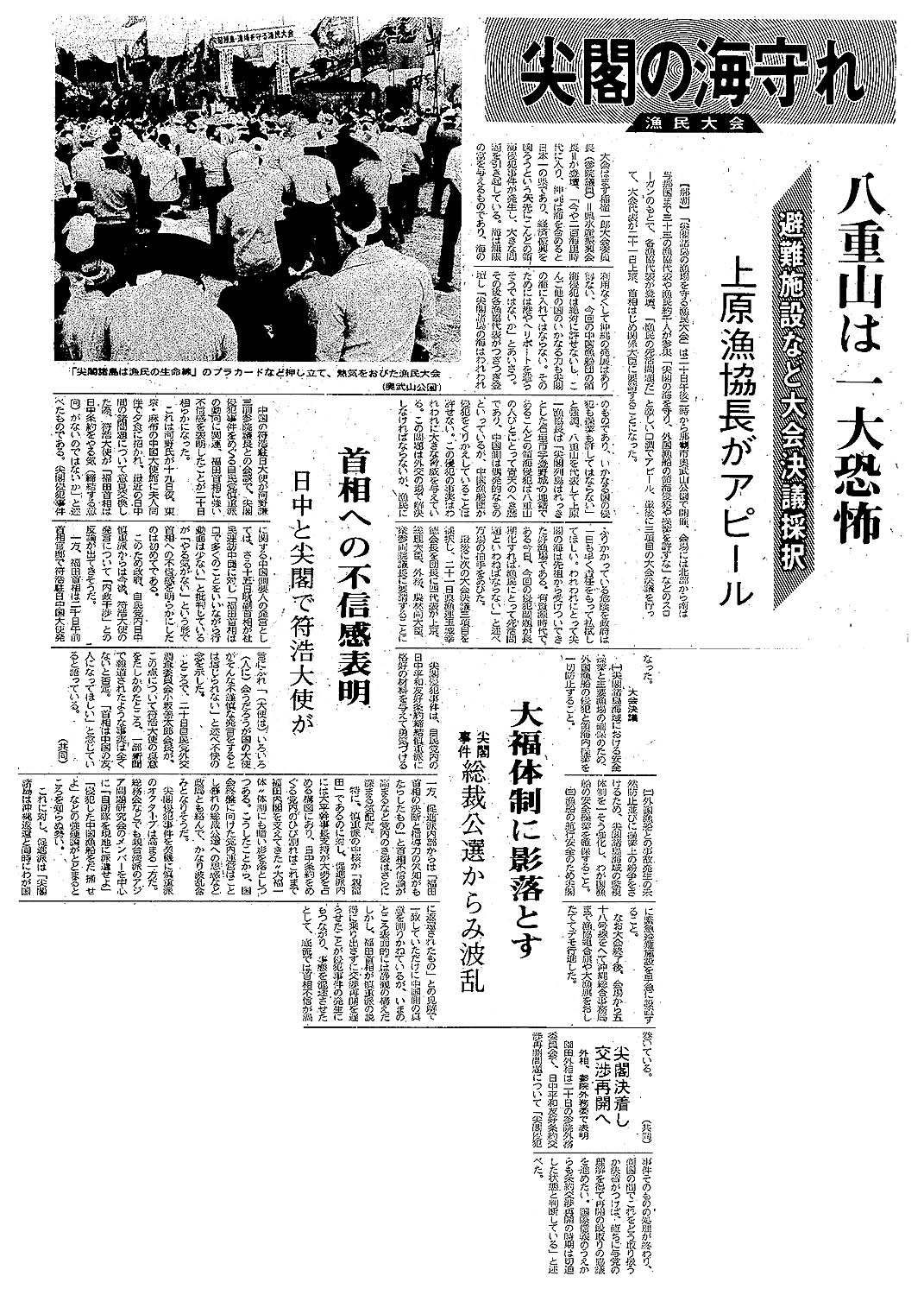 > 漁民大会 尖閣の海守れ/八重山は一大恐怖/避難施設など大会決議採択 /上原漁協長がアピール: