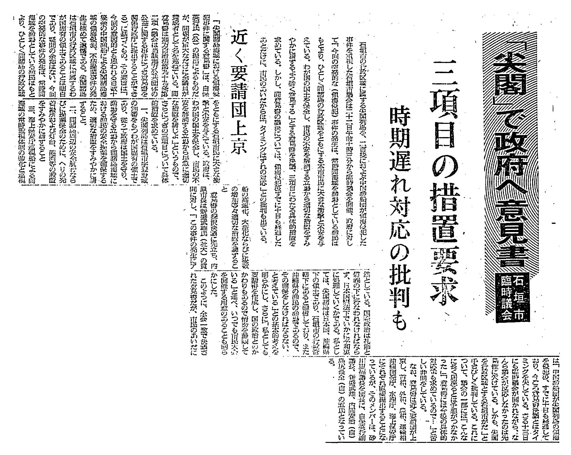 > 「尖閣」で政府へ意見書/石垣市臨時議会/三項目の措置要求/時期遅れ対応の悲観も: