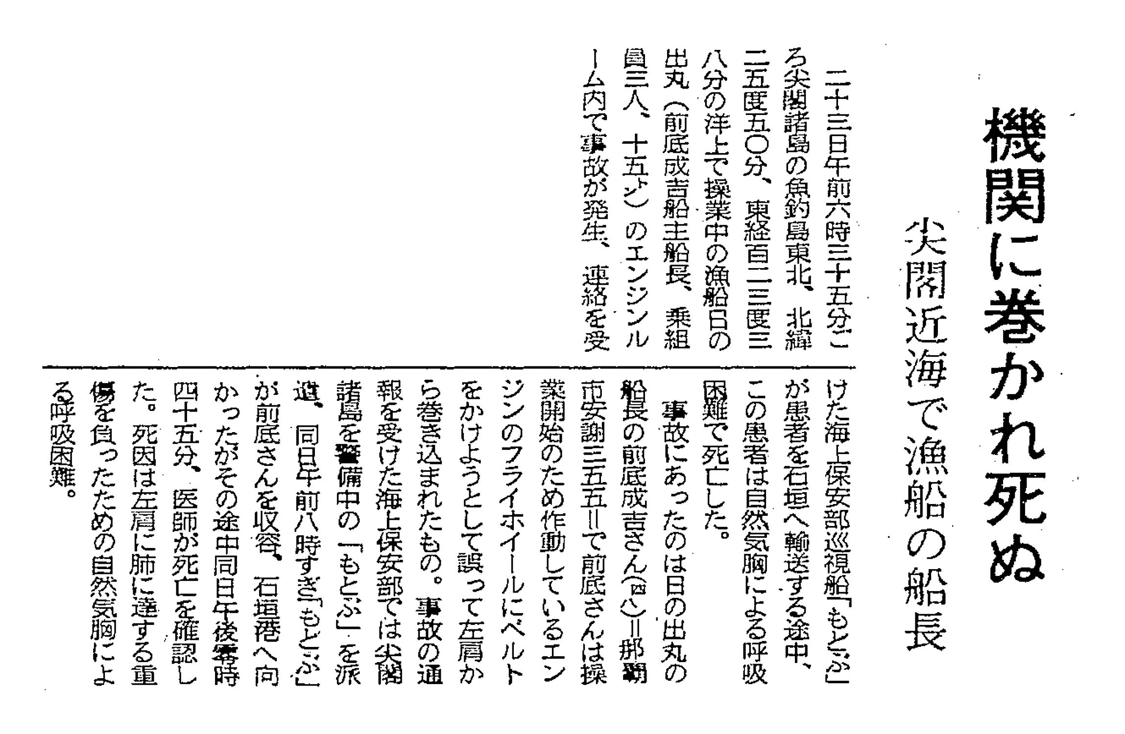 > 機関に巻かれ死ぬ/尖閣近海で漁船の船長:
