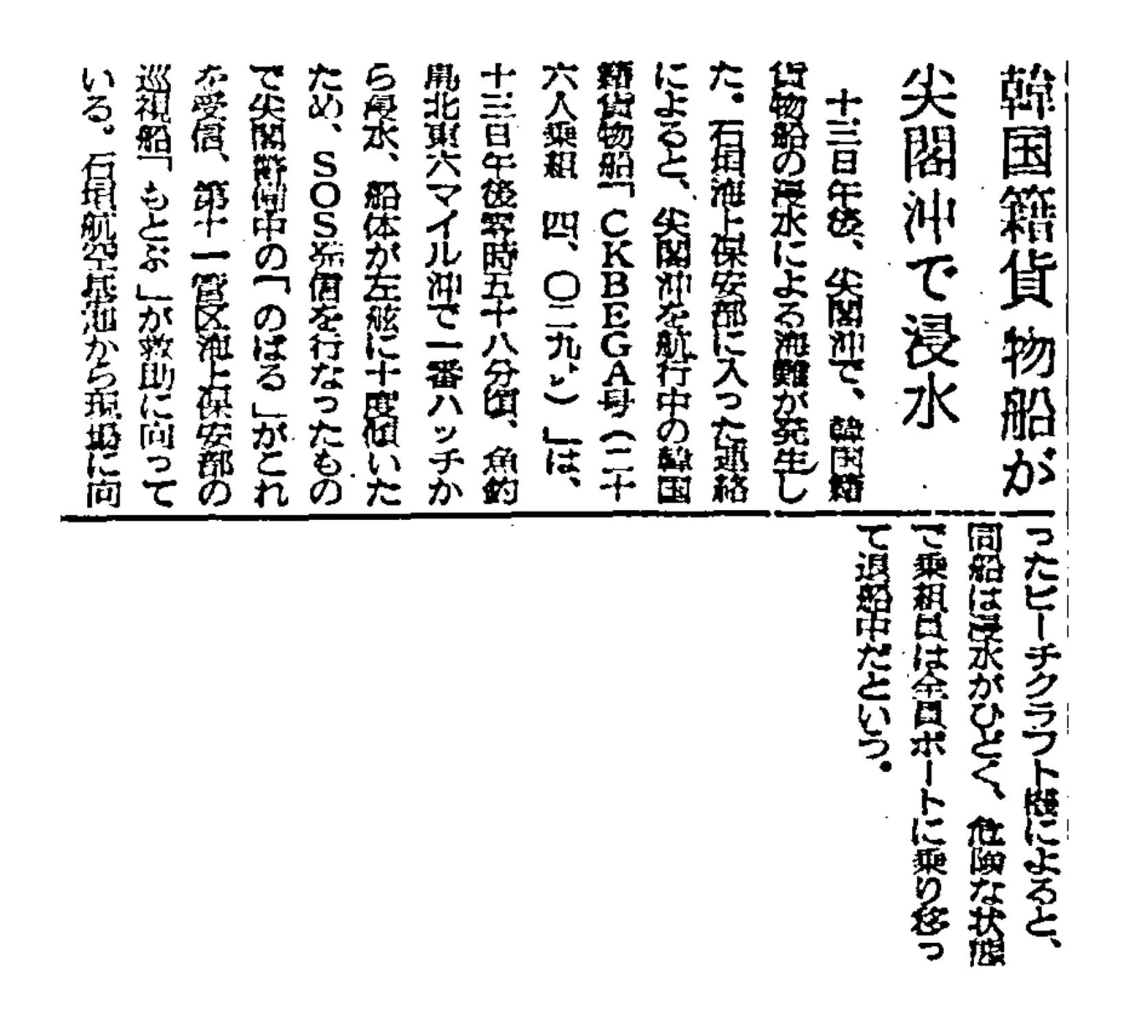 > 韓国籍貨物船が尖閣沖で浸水: