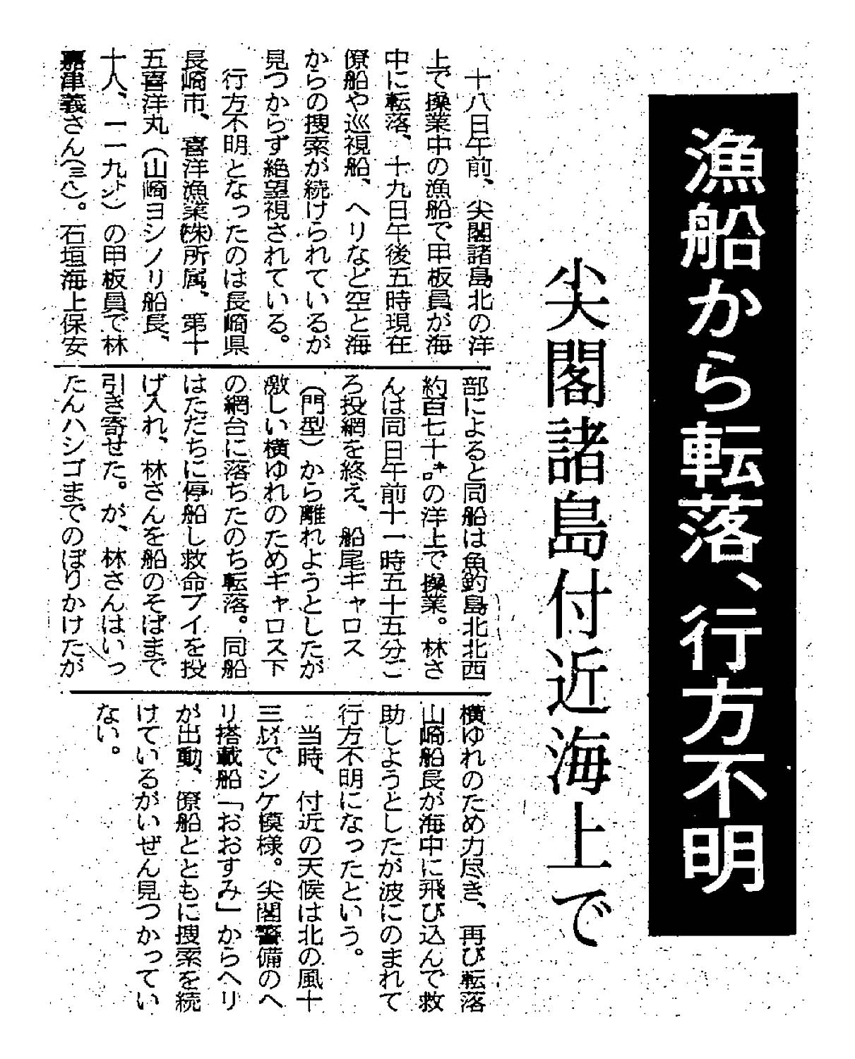 > 漁船から転落、行方不明/尖閣諸島付近海上で: