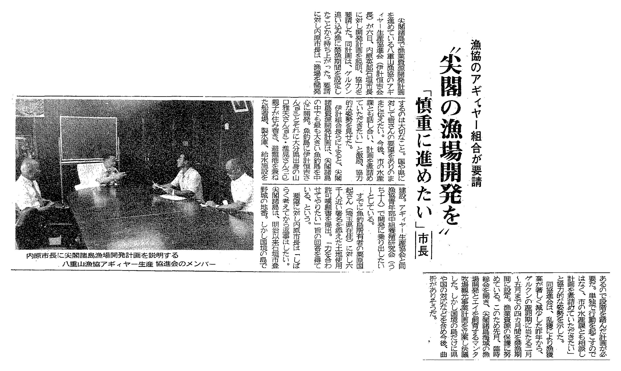 > 漁協のアギィヤー組合が要請/”尖閣の漁場開発を”/「慎重に進めたい」 市長: