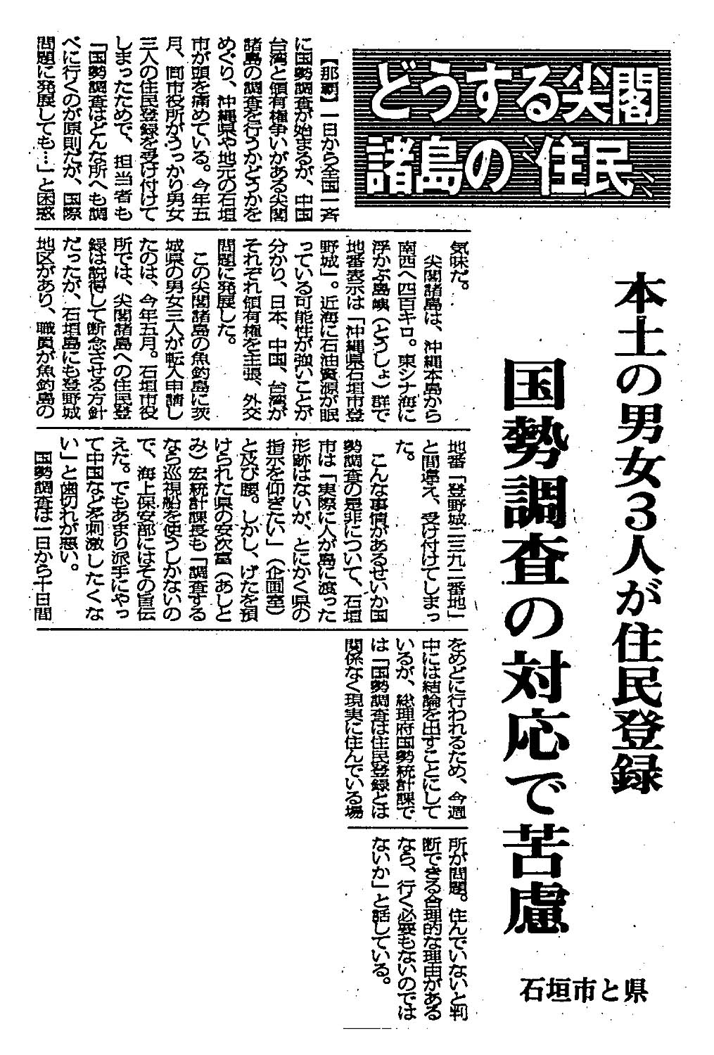 > どうする尖閣諸島の”住民”/本土の男女3人が住民登録/石垣市と県 国勢調査の対応で苦慮: