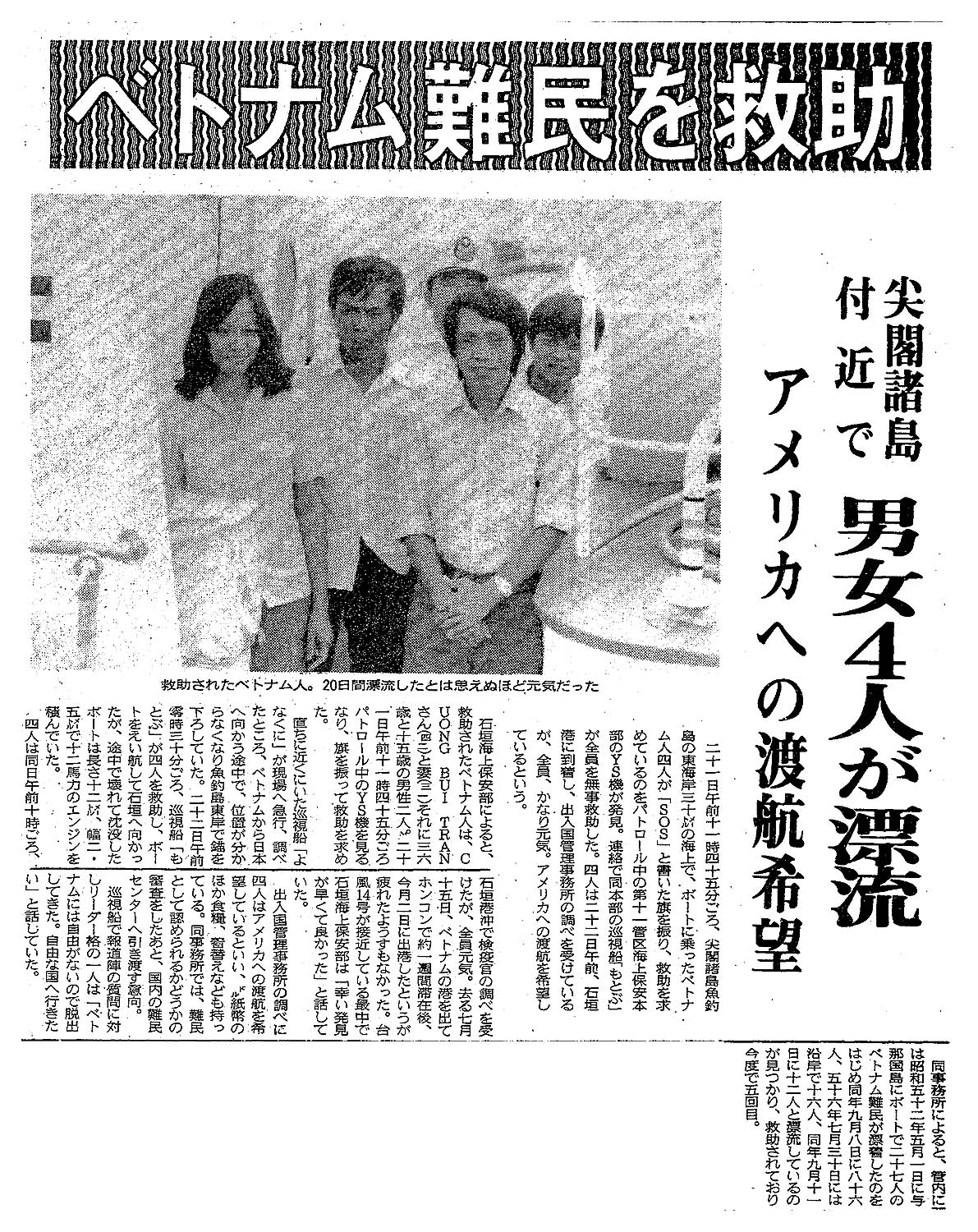 > ベトナム難民を救助/尖閣諸島付近で 男女4人が漂流/アメリカへの渡航希望: