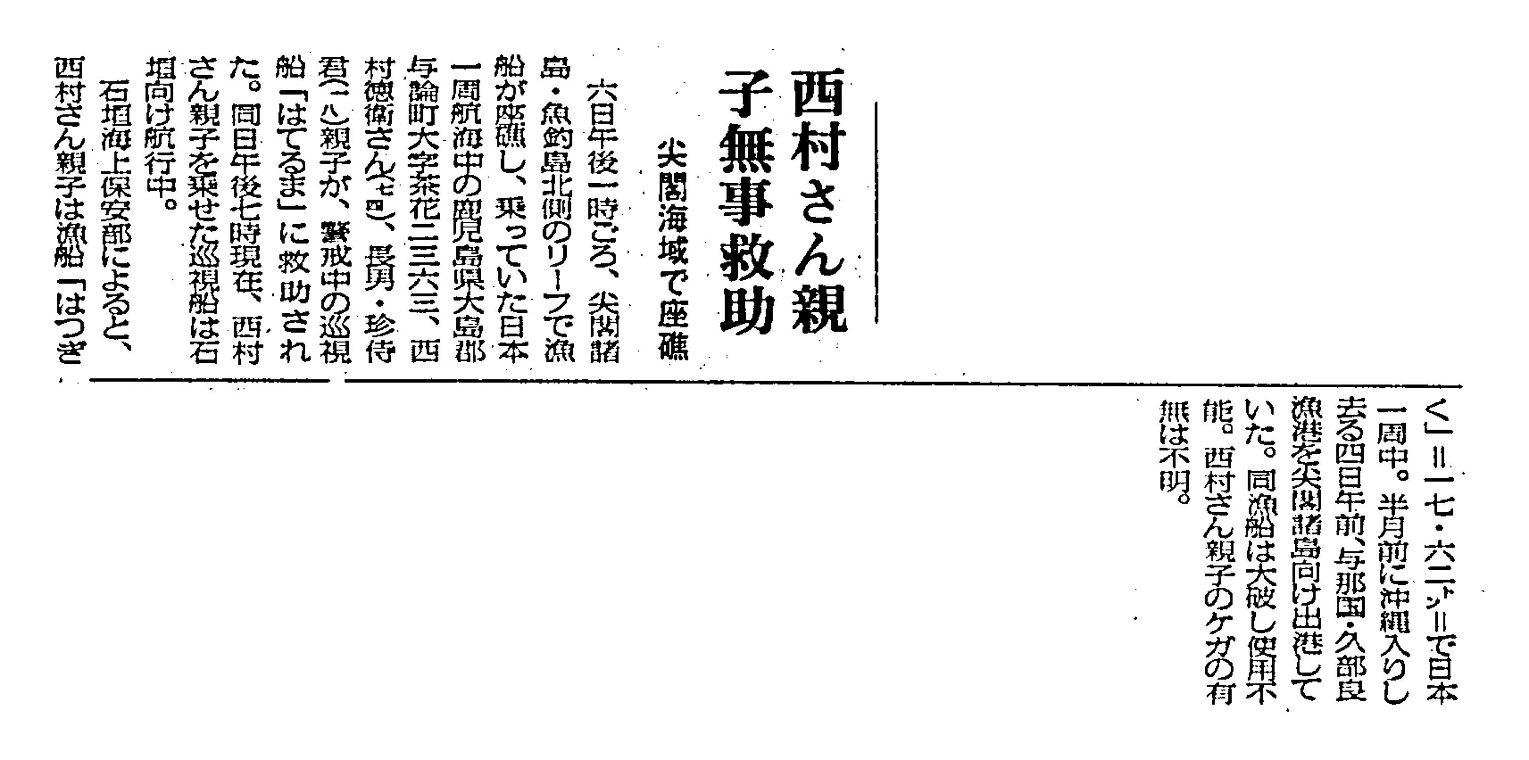 > 西村さん親子無事救助/尖閣海域で座礁: