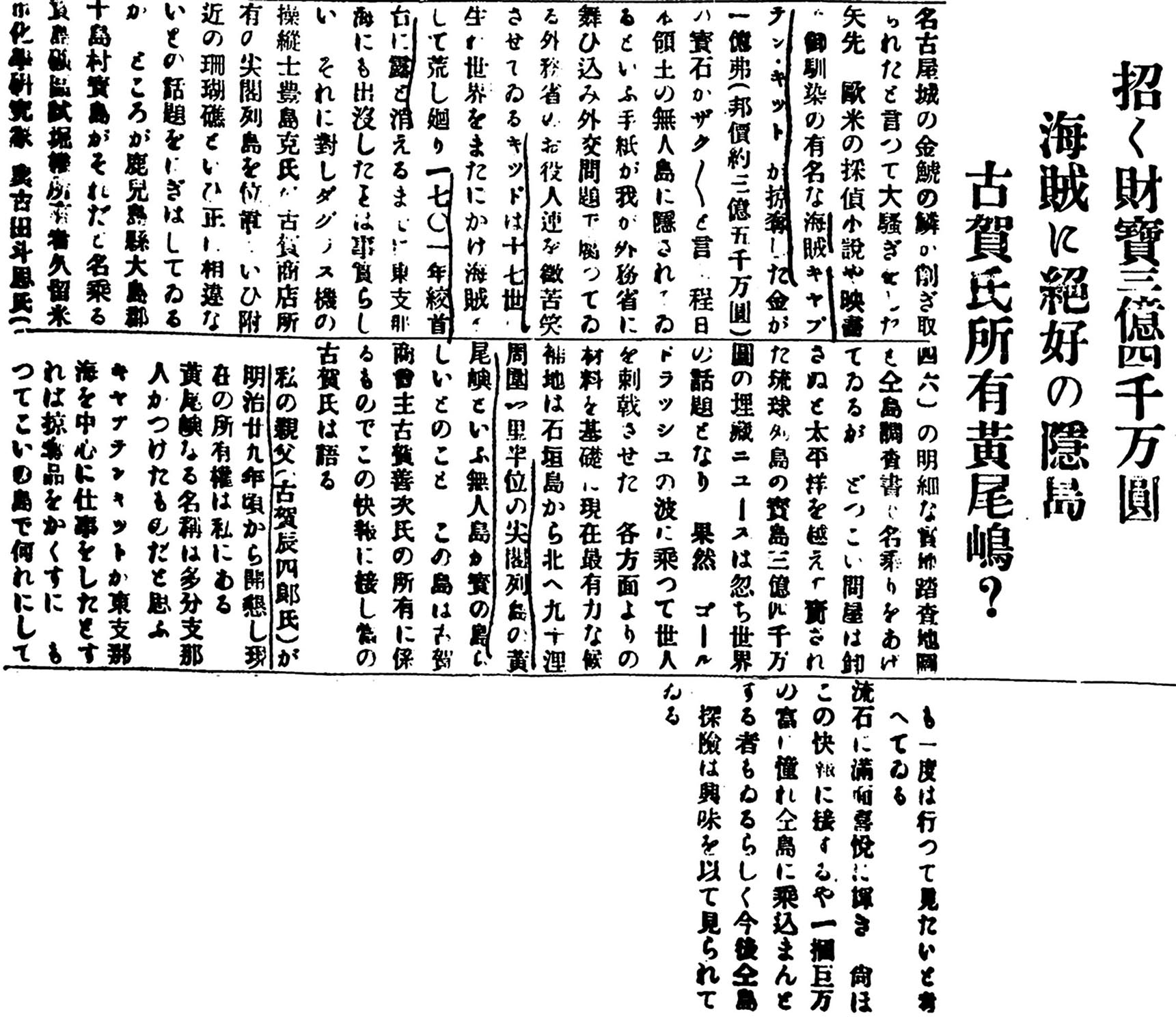 名古屋城の金鯱の鱗が削ぎ取られたと言って大騒ぎをした失先、欧米の採偵小説や映画■御馴染の有名な海賊キャプテン・キットが掠奪した金が一億弗(邦価約三億五千万円)の宝石がザクザクと言■程日本領土の無人島に隠されているという手紙が我が外務省に舞い込み、外交問題で腐っている外務省のお役人連を微苦笑させている。キッドは十七世■生れ、世界をまたにかけ海賊■して荒し廻り、一七〇一年絞首台に露と消えるまでに東支那海にも出没したことは事実らしい。それに対しダグラス機の操縦士豊島克氏が、古賀商店所有の尖閣列島を位置■言い附近の珊瑚礁と言い正に相違ないとの話題をにぎわしているが、ところが鹿児島県大島郡十島村宝島がそれだと名乗る宝島鉱区試掘権所有者久留米市化学研究家與古田斗思氏(四六)の明細な実施踏査地図と同島調査書■名乗りをあげているが、どっこい問屋は卸さぬと太平洋を越えて齎された琉球列島の宝島三億四千万円の理蔵ニュースは忽ち世界の話題となり、果然 ゴールドラッシュの波に乗って世人を刺戟させた。各方面よりの材料を基礎に現在最有力な候補地は、石垣島から北へ九十浬周囲一里半位の尖閣列島の黄尾嶼という無人島が宝の島らしいとのこと。この島は古賀商會主古賀善次氏の所有に係るもので。この快報に接し当の古賀氏は語る。