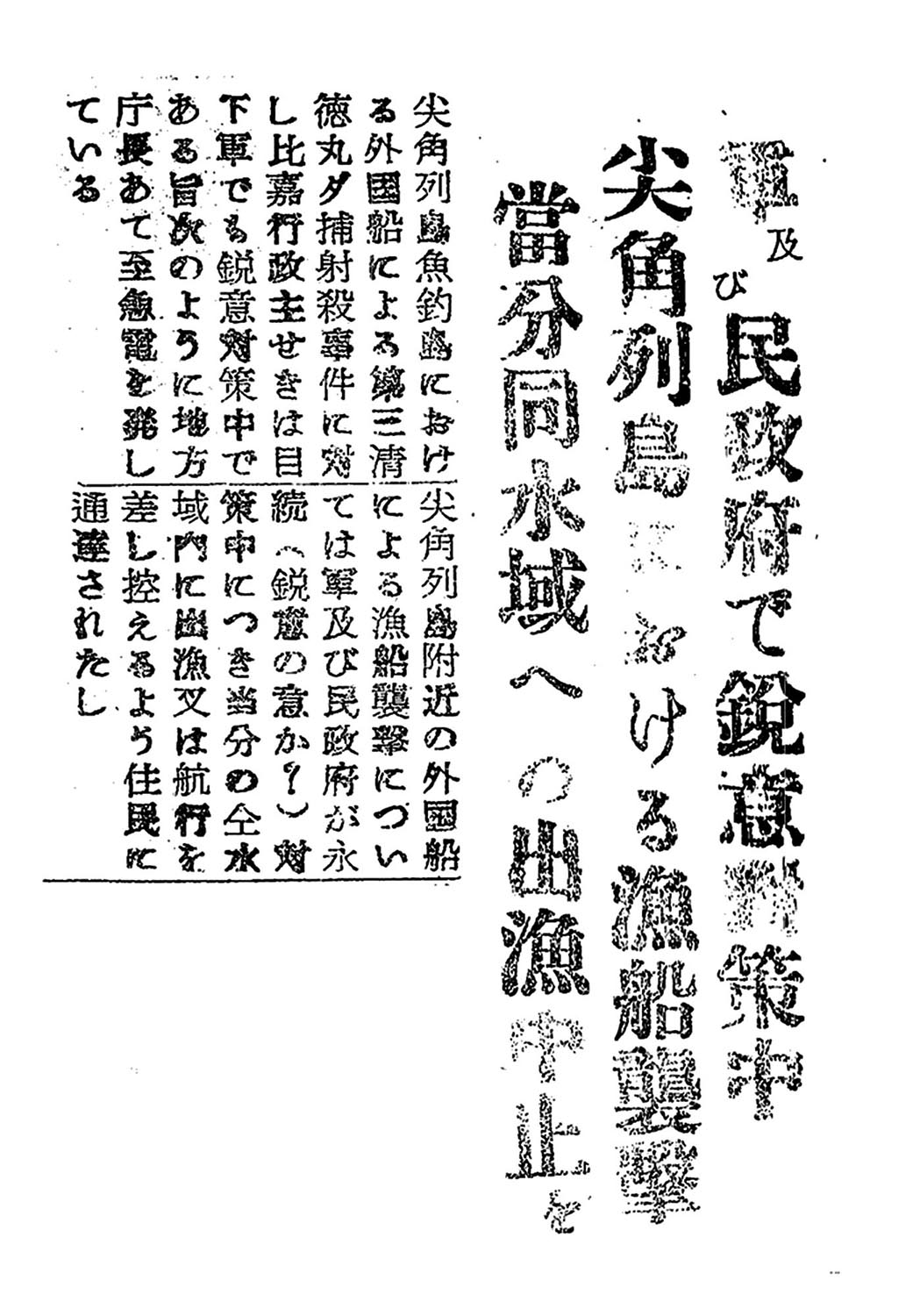 軍および民政府で営為対策中 / 尖角列島における漁船襲擊 當分水域への出漁中止を 現代仮名遣いテキスト