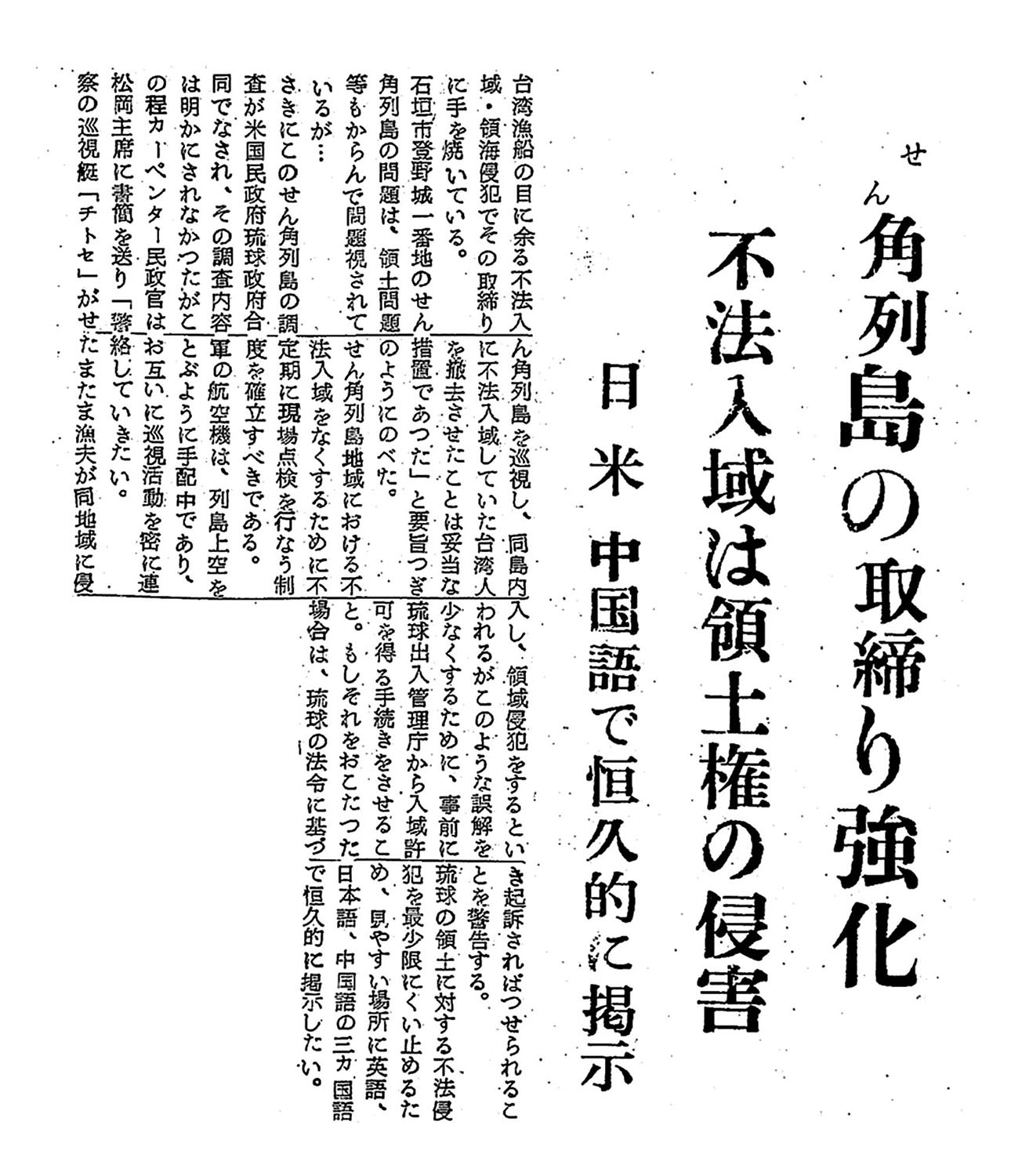 Home > 昭和 > せん角列島の取締り強化/ 不法入域は領土権の侵害 日 米 中国語で恒久的に掲示:現代仮名遣いテキスト