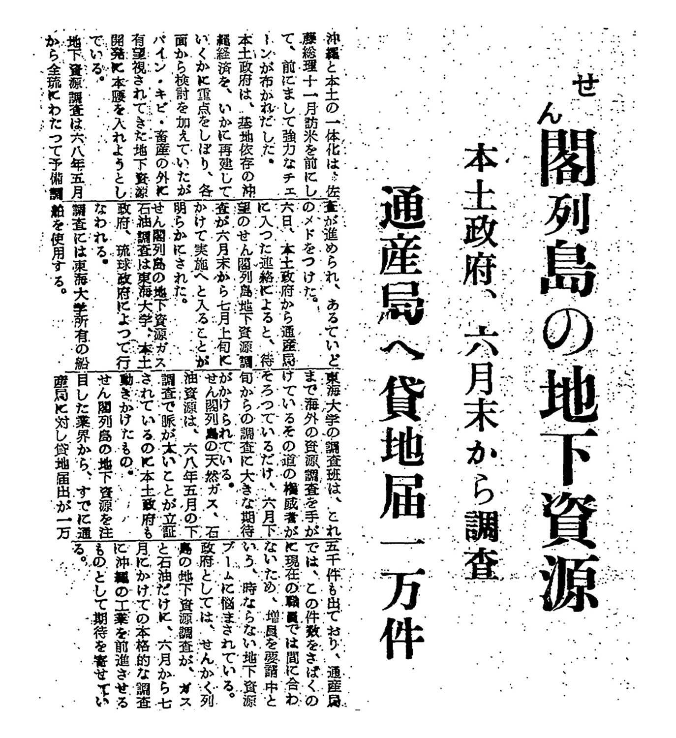 Home > 昭和 > せん閣列島の地下資源/ 本土政府、六月末から調査 通産局へ貸地届一万件:現代仮名遣いテキスト