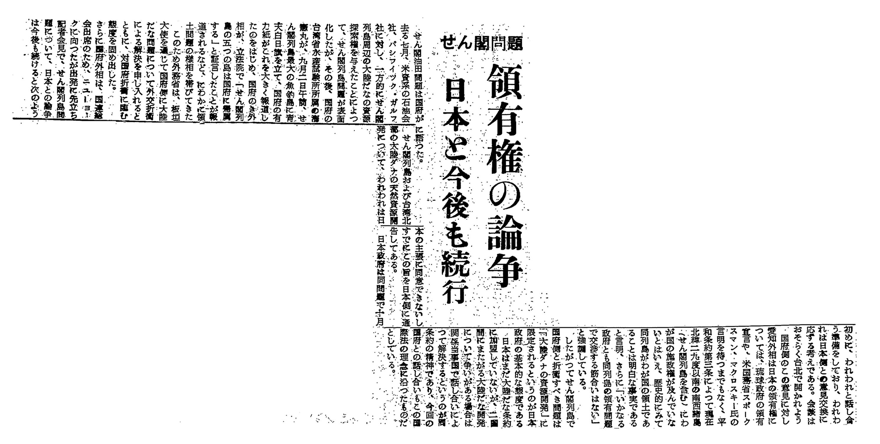 国府側のこの意見に対し愛知外相は日本の領有権については、琉球政府の領有宣言や、米国務省スポークスマン、マクロスキー氏の言明を待つまでもなく、平和条約第三条によつて現在北緯二九度以南の南西諸島(せん閣列島を含む)にわが国の施政権が及んでいないとはいえ、歴史的にみて同列島がわが国の領土であることは明白な事実であると言明、さらに「いかなる政府とも同列島の領有問題で交渉する筋合いはない」と強調している。したがつて尖閣列島で国府側と折衝すべき問題は「大陸ダナの資源開発」に限定されるというのが日本政府の基本的な態度である