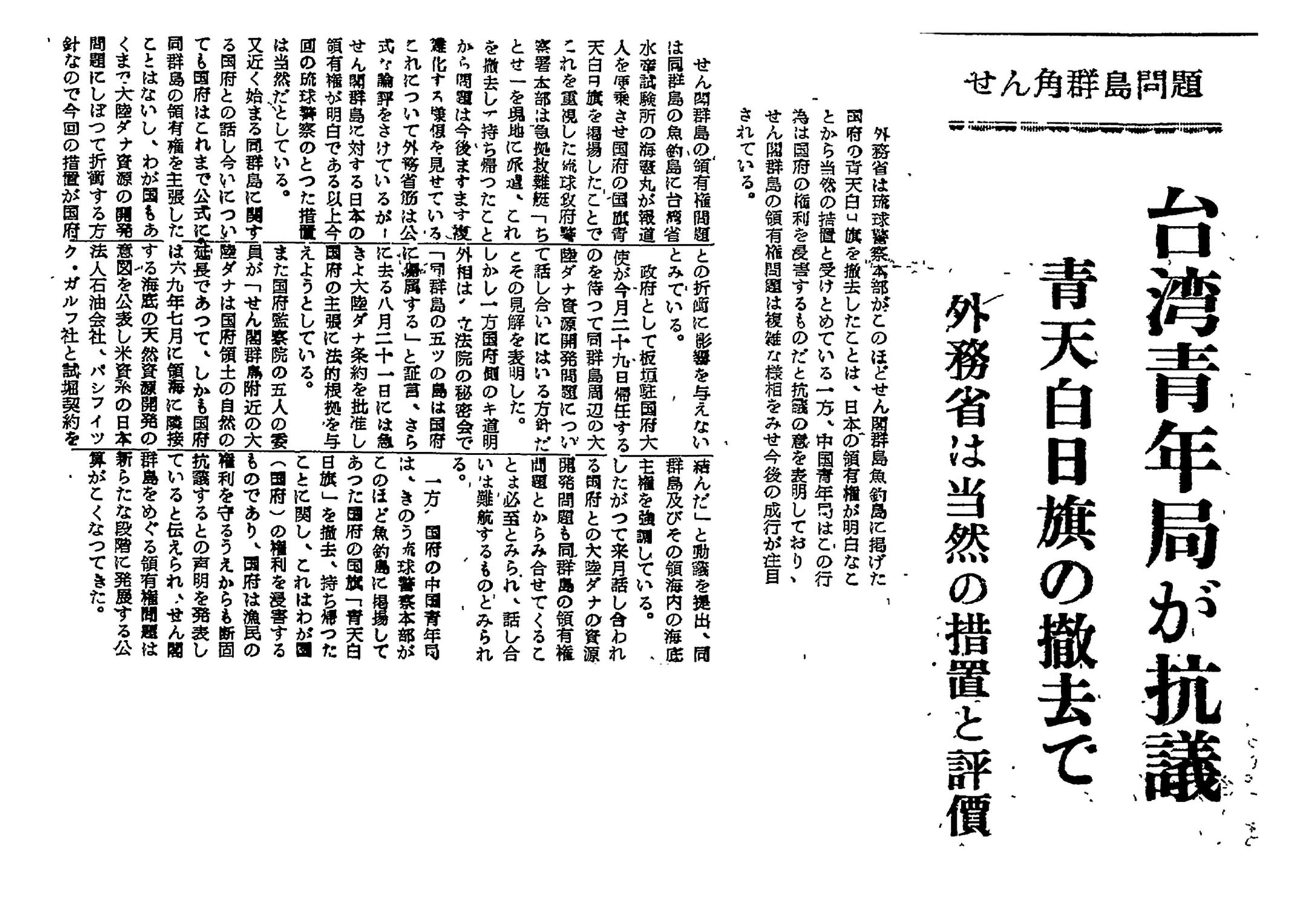 外務省は琉球警察本部がこのほどせん閣群島魚釣島に掲げた国府の晴天白日旗を撤去したことは、日本の領有権が明白なことから当然の措置と受けとめている一方、中国青年局はこの行為は国府の権利を侵害するものだと抗議の意を表明しており、せん閣群島の領有権問題は複雑な様相をみせ今後の成行が注目されている。