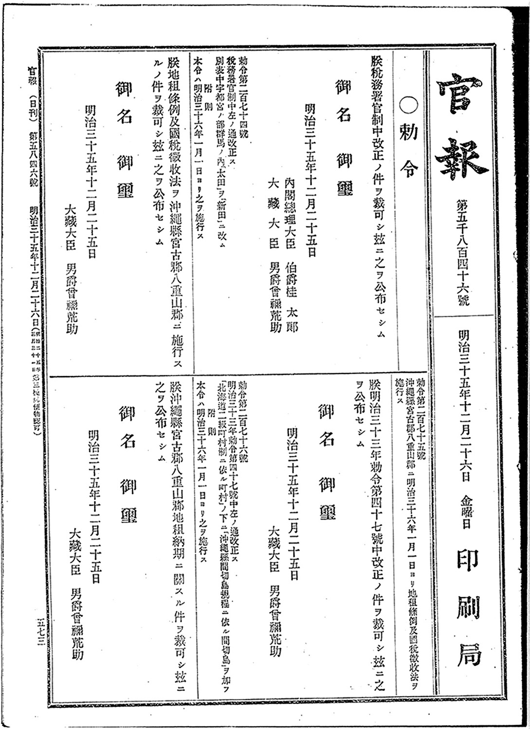 官報 (第5846号) 朕地租条例及国税徴収法ヲ沖縄県宮古郡八重山郡ニ施行スルノ件ヲ裁可シ茲ニ之ヲ公布セシム 明治35年 1902-12-26