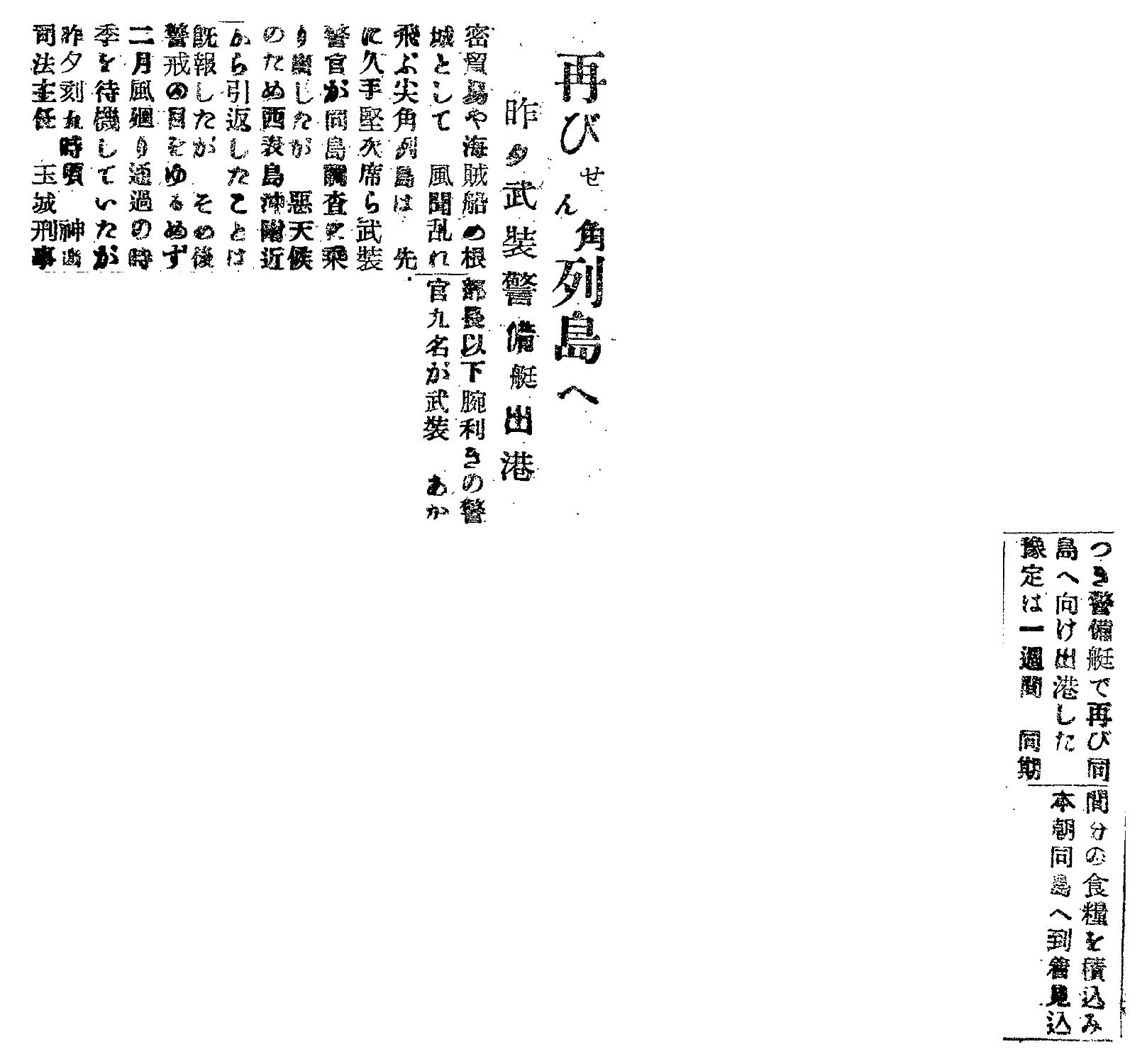 > 再びせん角列島へ/昨夕武装警備艇出港: