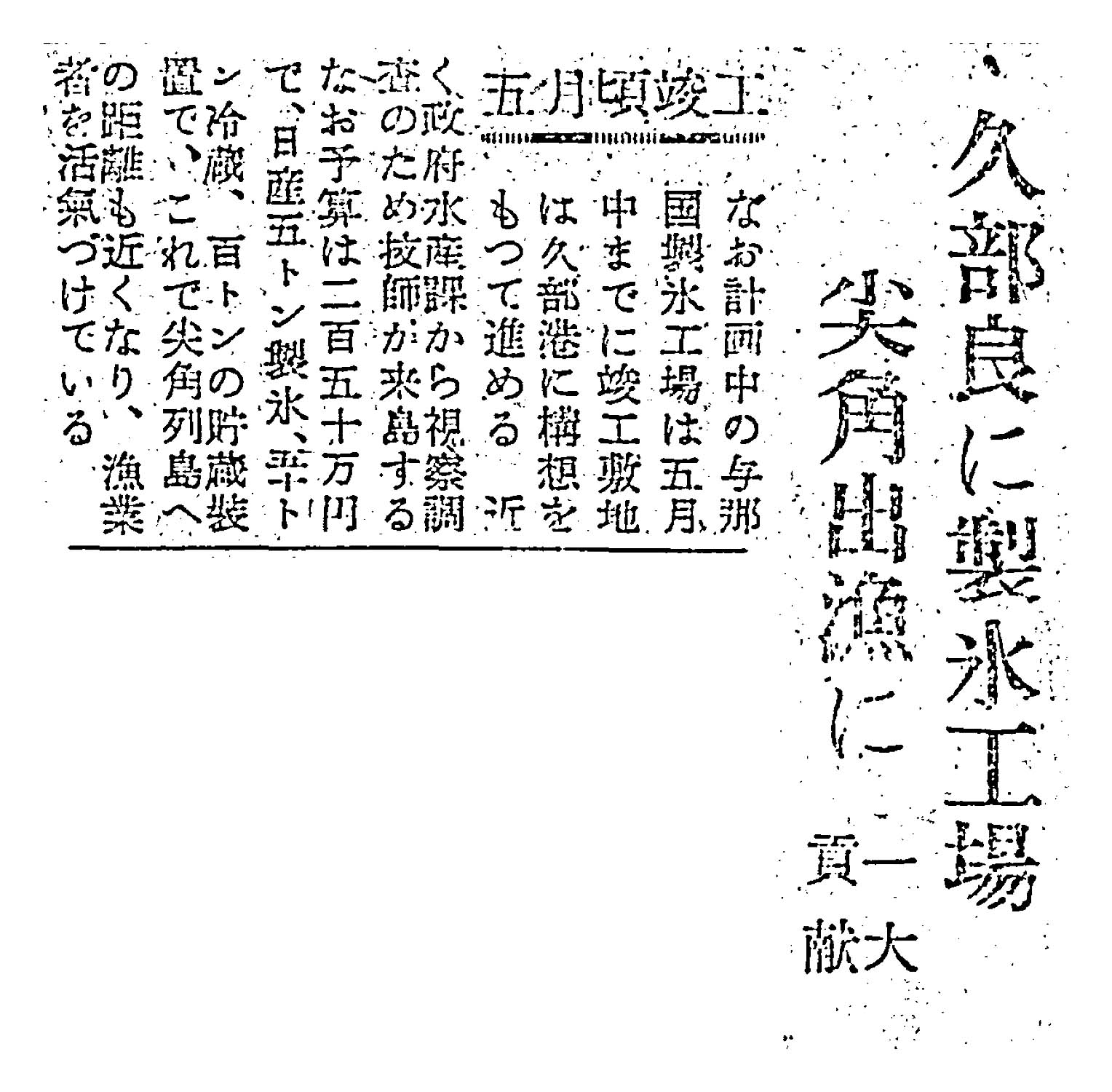 > 久部良に製氷工場/尖閣出漁に一大貢献: