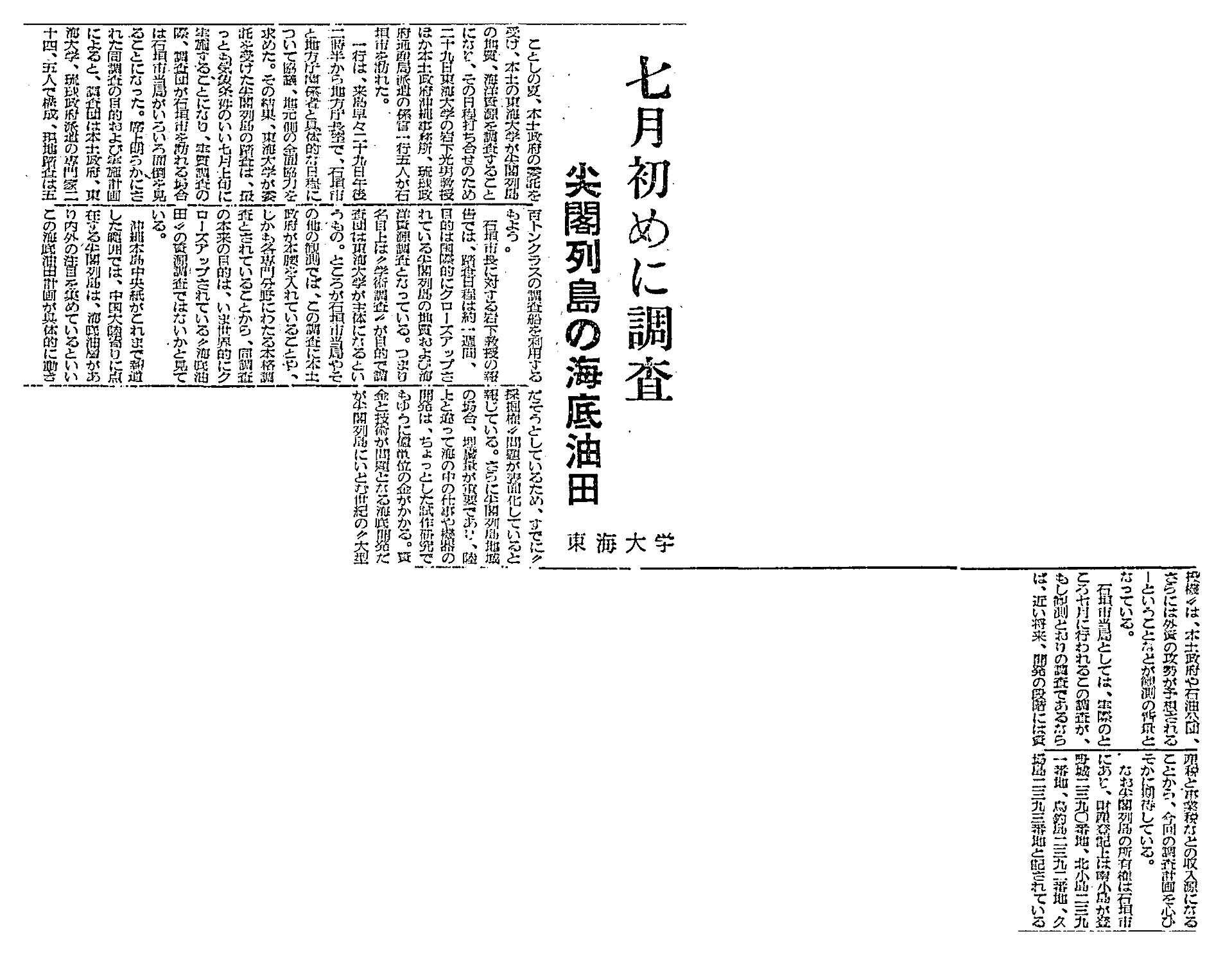 七月初めに調査/尖閣列島の海底油田/東海大学