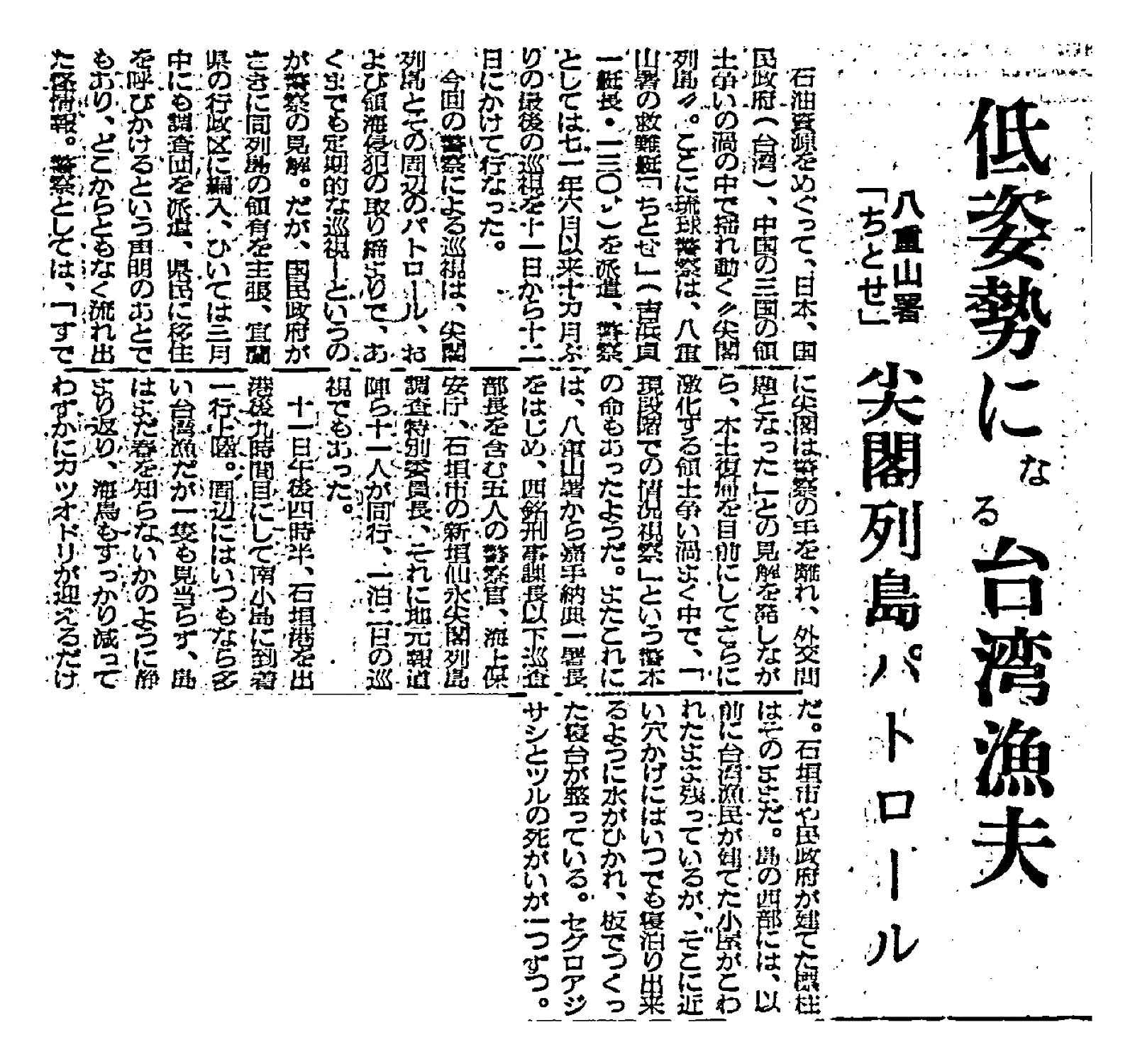 低姿勢になる台湾漁夫/八重山署の「 ちとせ 」尖閣列島パトロール