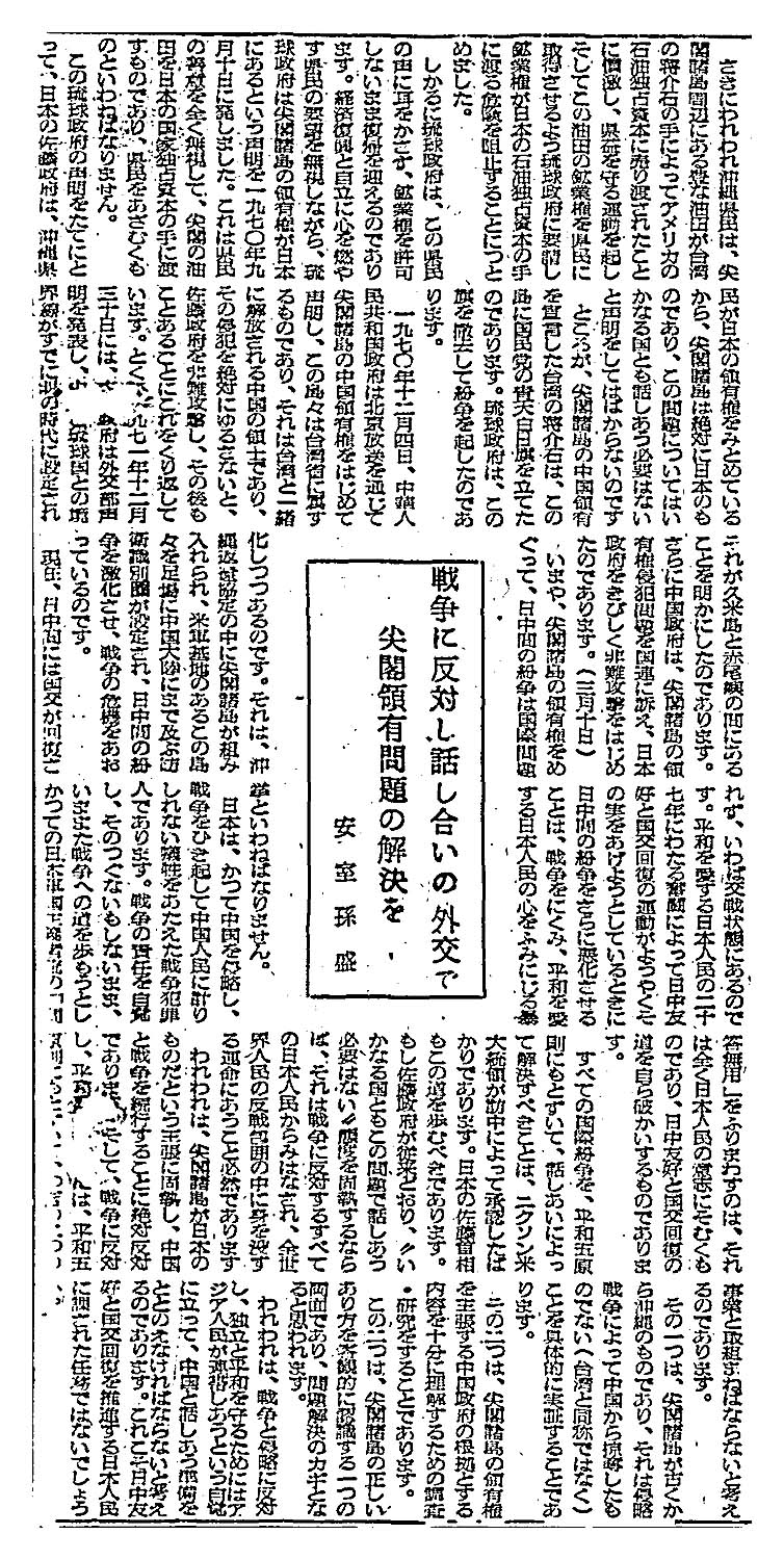 > 戦争に反対し話し合いの外交で尖閣領有問題の解決を/安室孫盛: