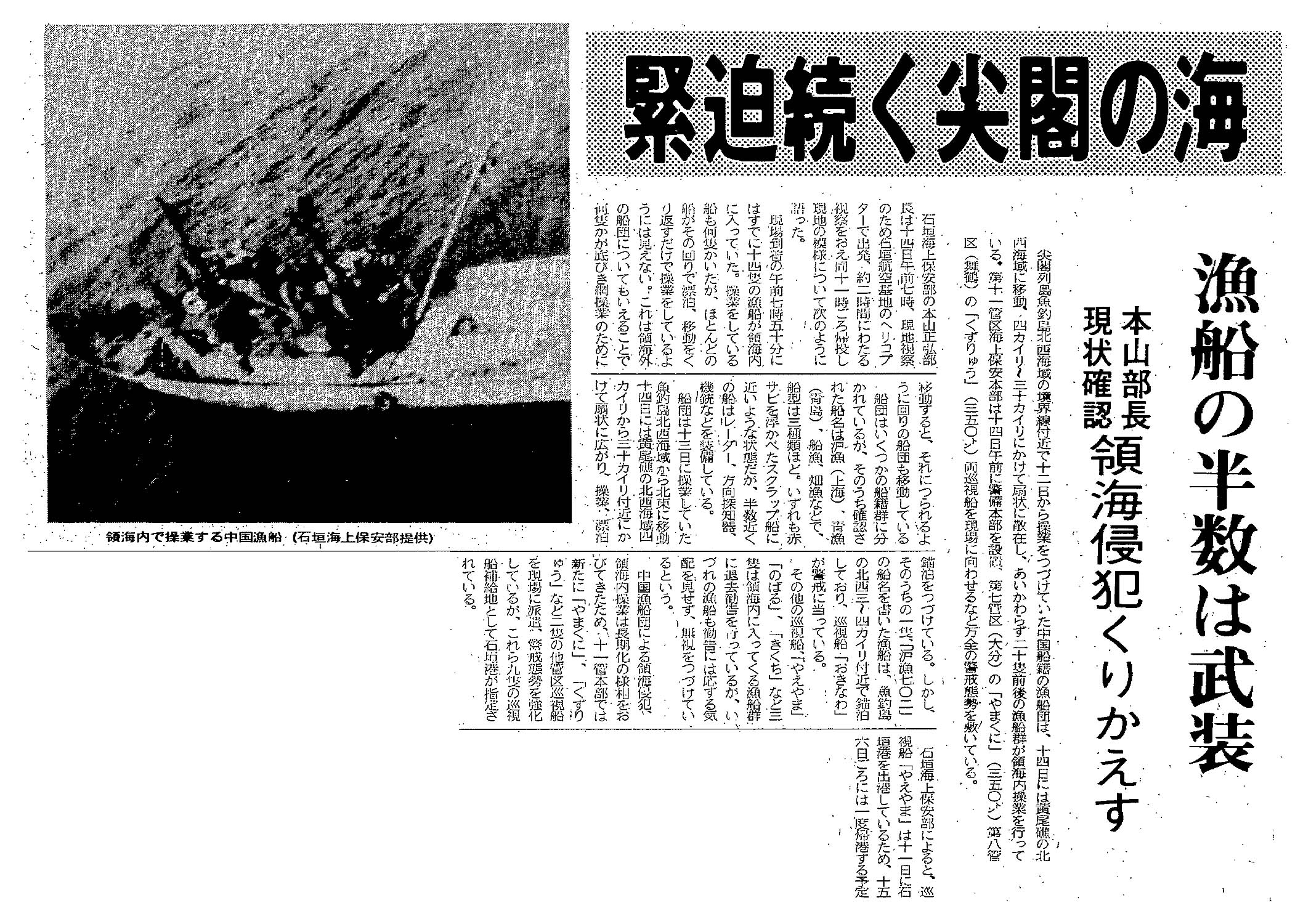 > 緊迫続く尖閣の海/漁船の半数は武装/本山部長現状確認 領海侵犯くりかえす: