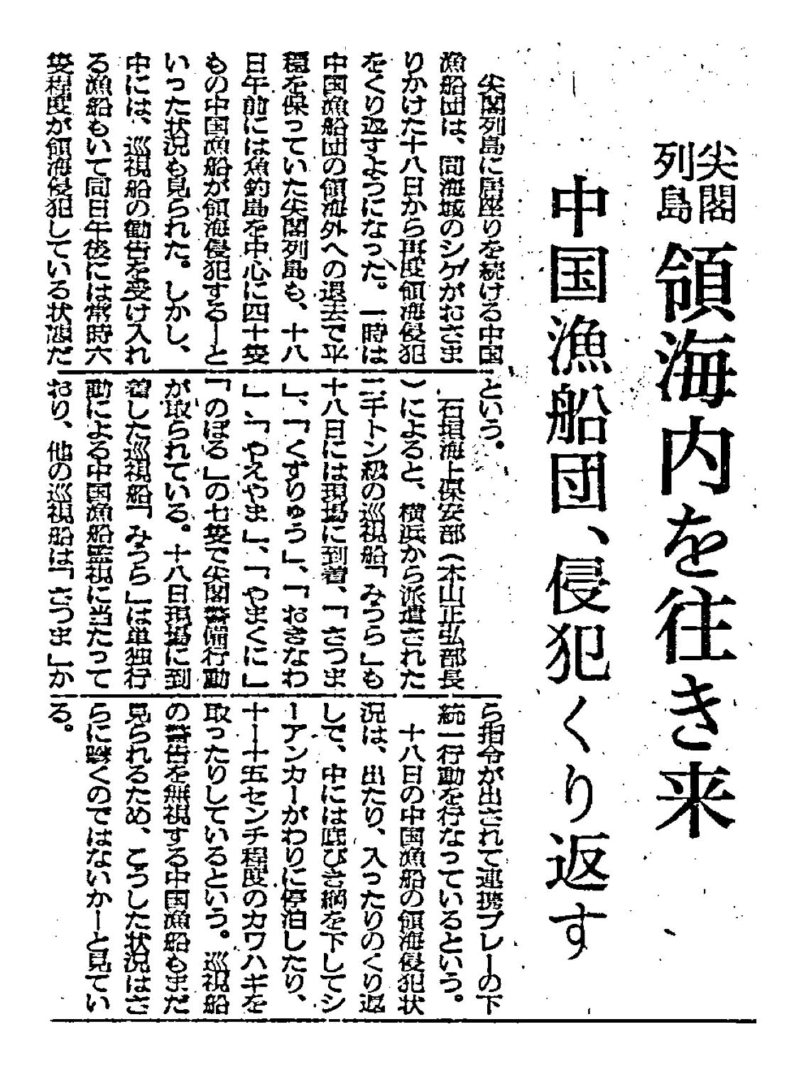 > 尖閣列島領海内を往き来/中国漁船団、侵犯くり返す: