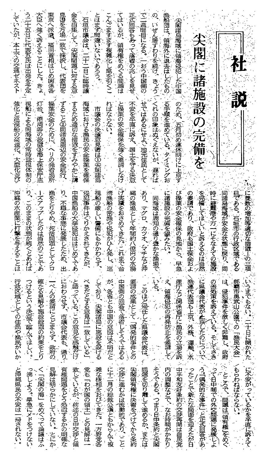 <社説>尖閣に諸施設の完備を