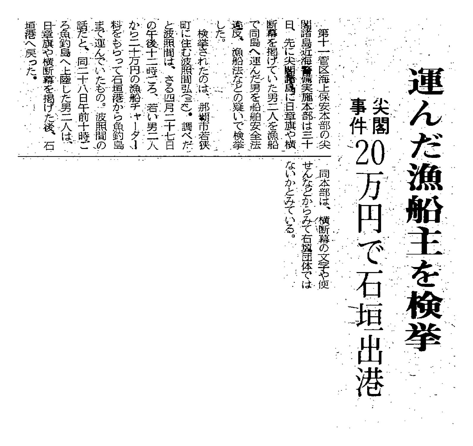 > 運んだ漁船主を検挙/尖閣事件 20万円で石垣出港: