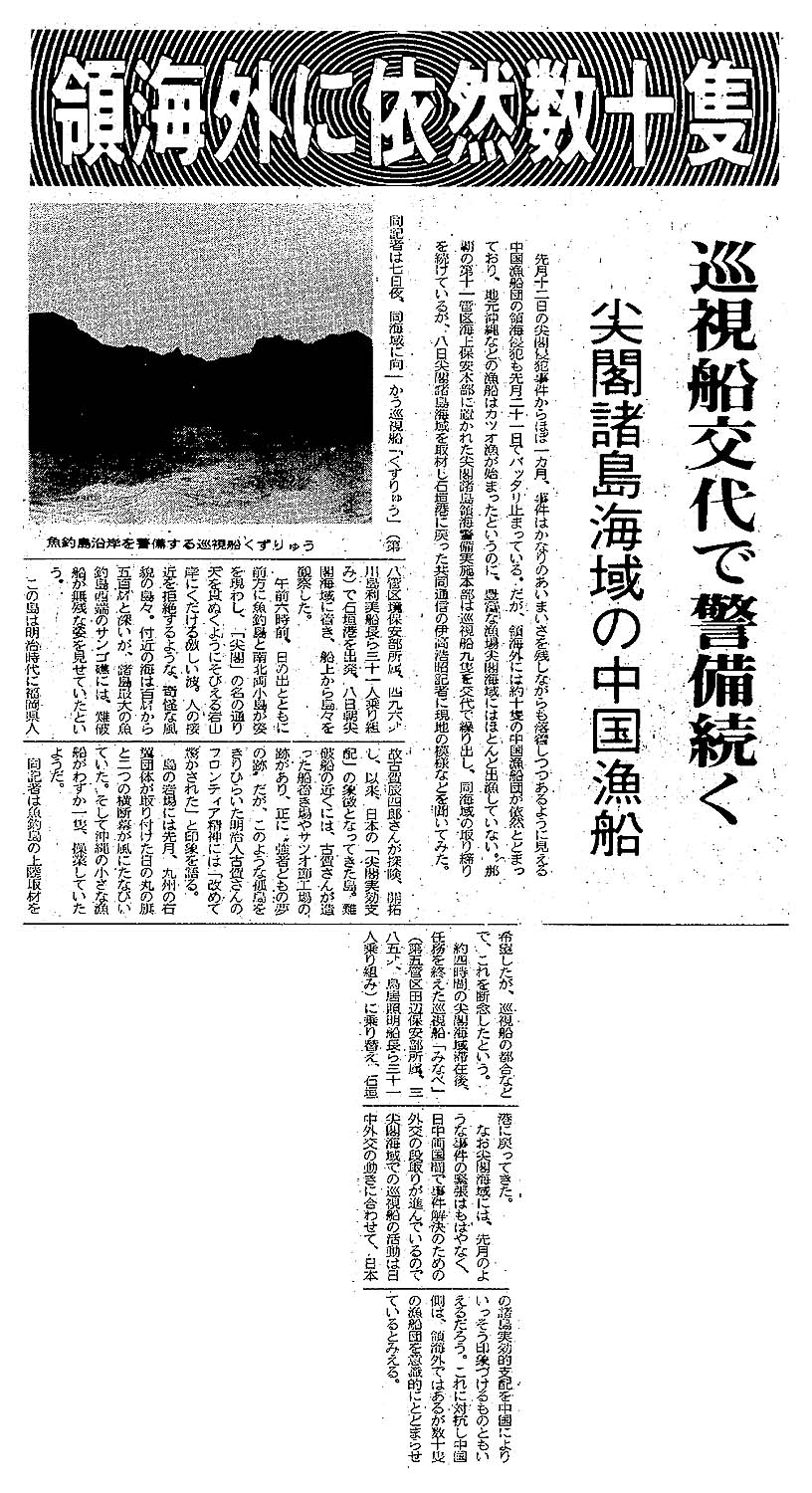 > 領海外に依然数十隻/巡視船交代で警備続く/尖閣諸島海域の中国漁船: