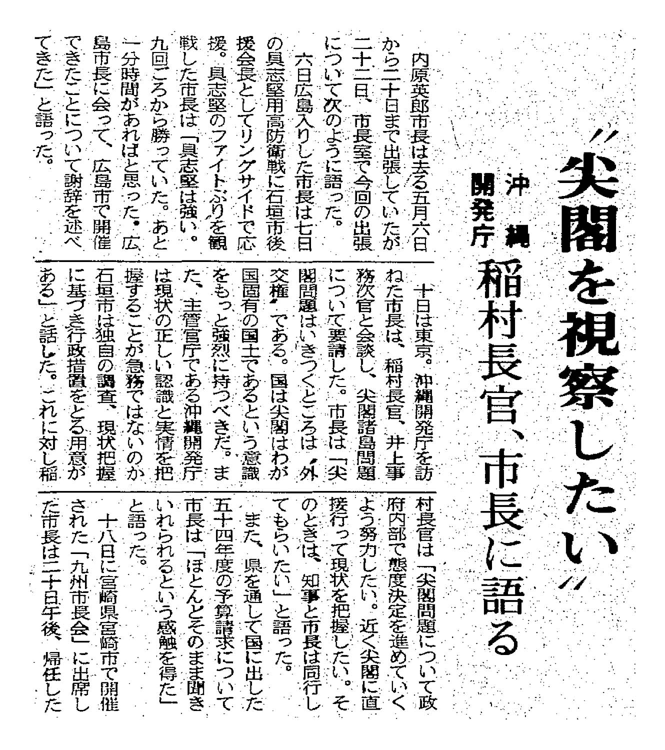 > ”尖閣を視察したい”/沖縄開発庁稲村長官、市長に語る: