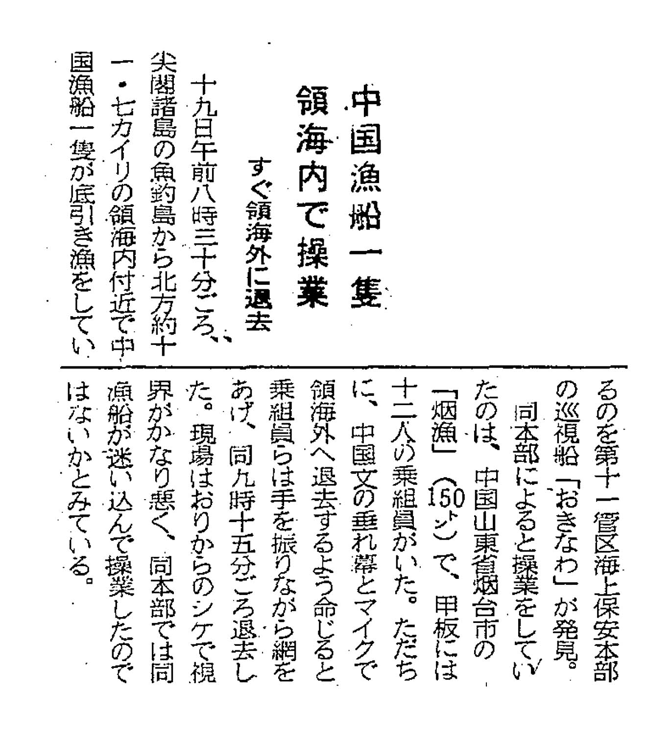 > 中国漁船一隻領海内で操業/すぐに領海外に退去: