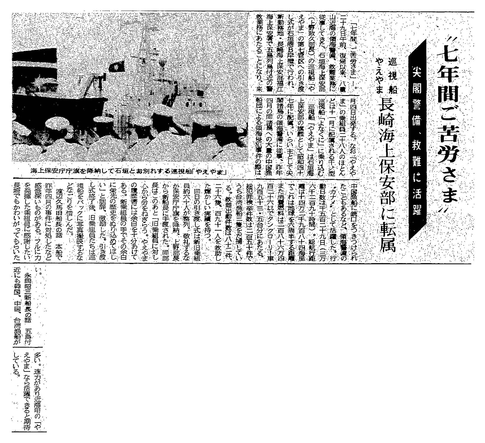 > ”7年間ご苦労さま”/尖閣警備 救難に活躍/巡視船やえやま 長崎海上保安部に転属: