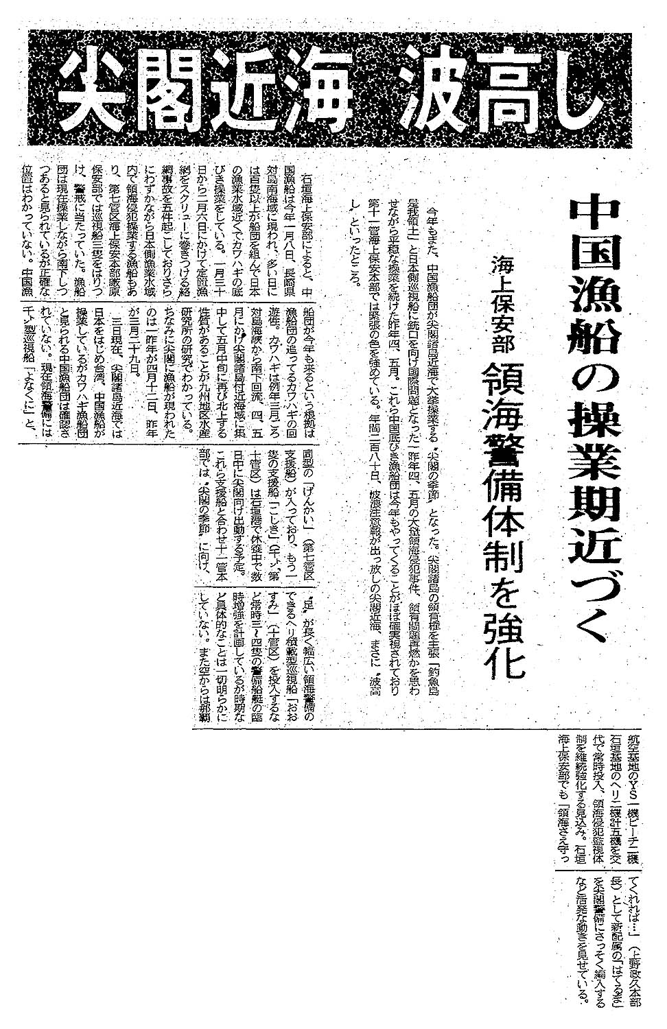 > 尖閣近海 波高し/中国漁船の操業期近づく/海上保安部 領海警備体制を強化: