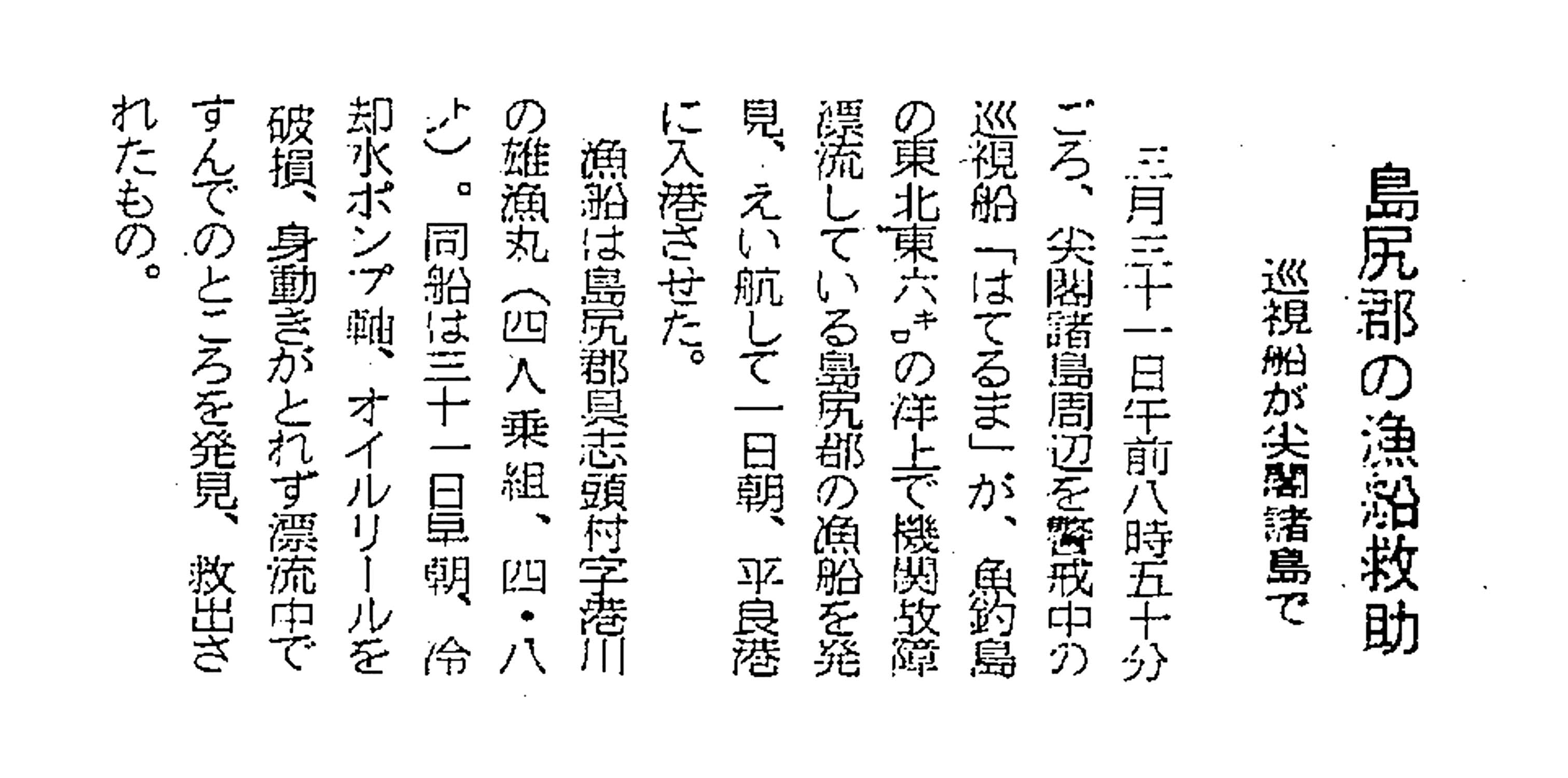 > 島尻郡の漁船救助/巡視船が尖閣諸島で: