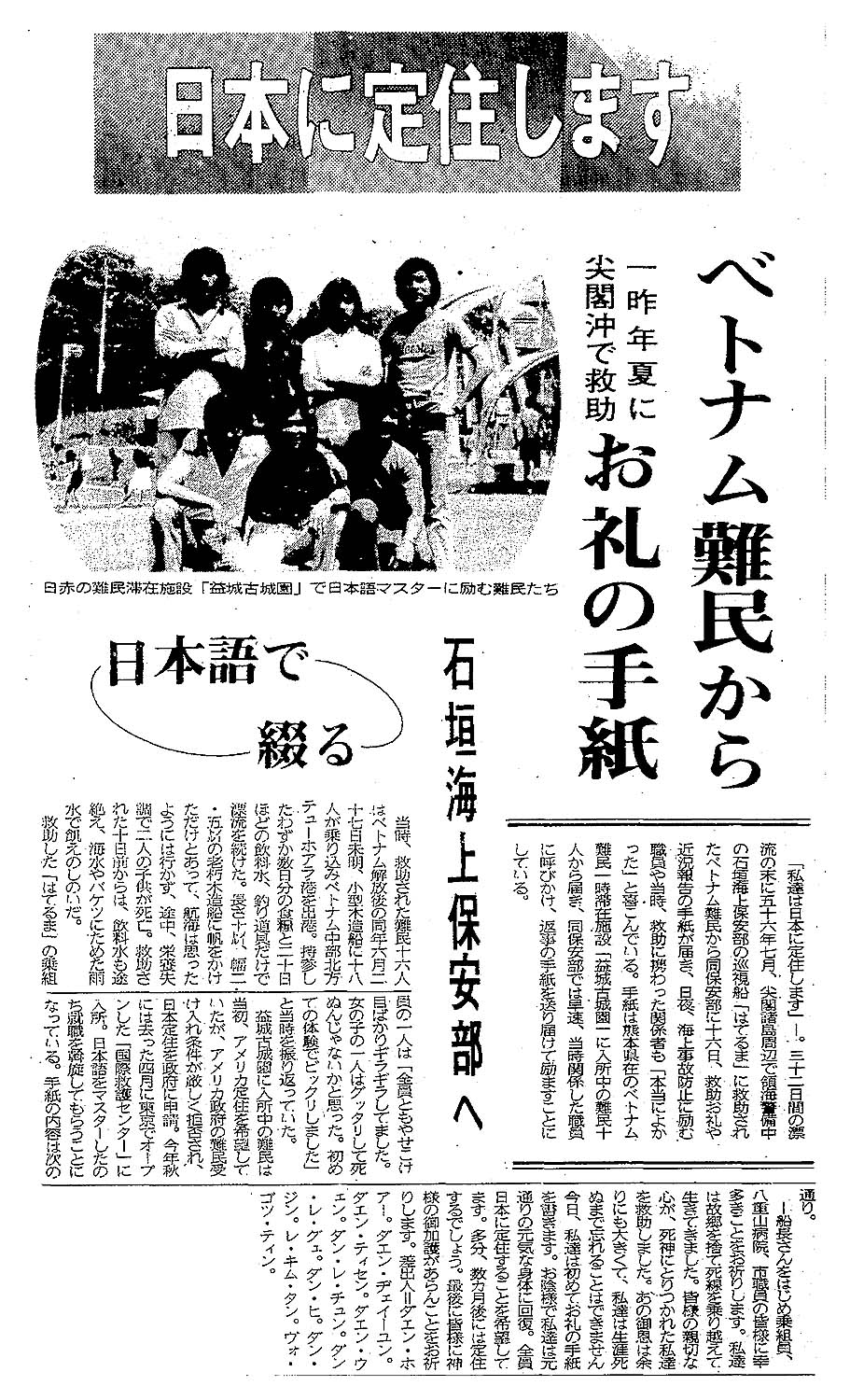 日本に定住します/ベトナム難民から一昨年夏に尖閣沖で救助/お礼の手紙/日本語で綴る/石垣海上保安部へ