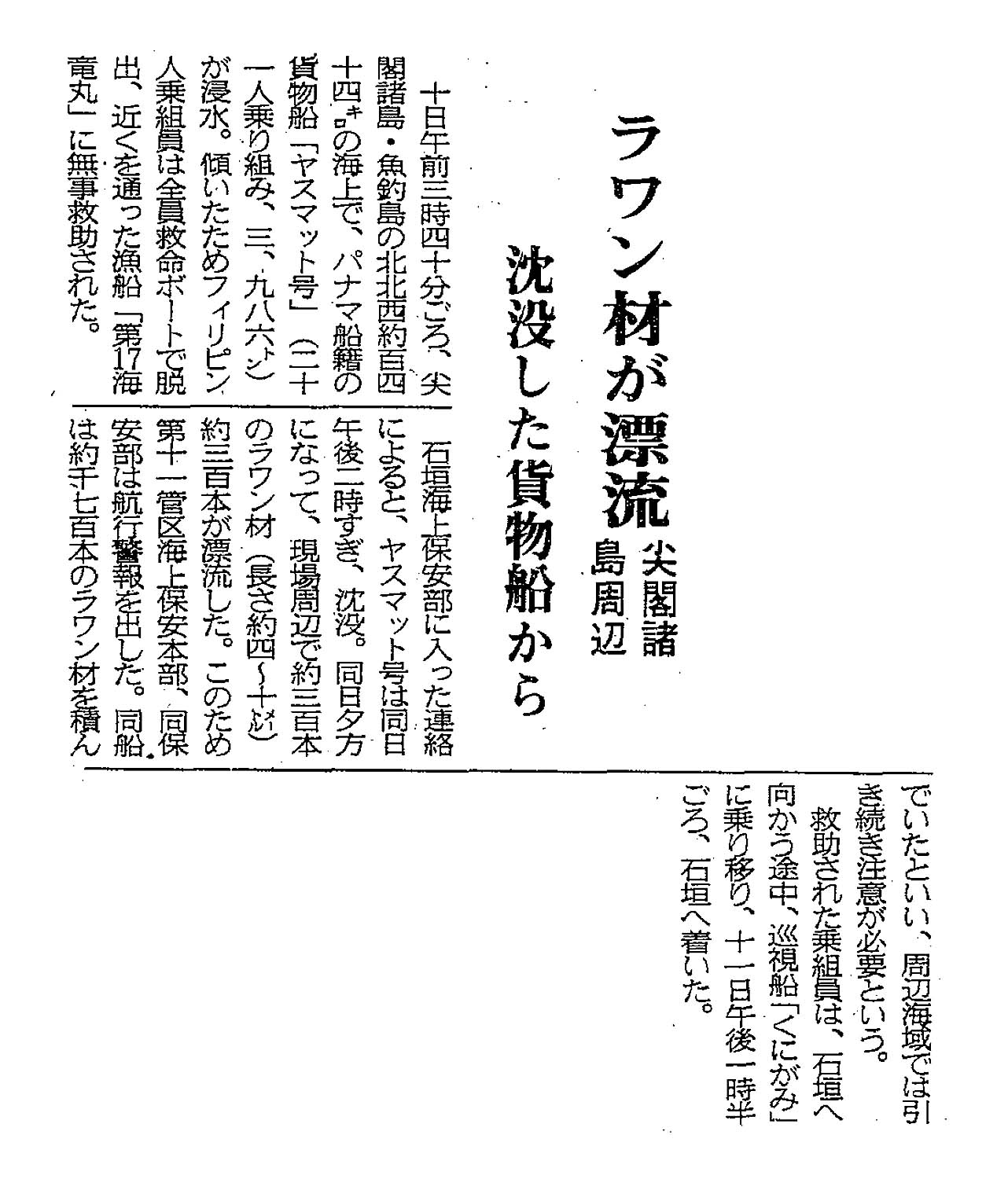 > ラワン材が漂流/尖閣諸島周辺/沈没した貨物船から: