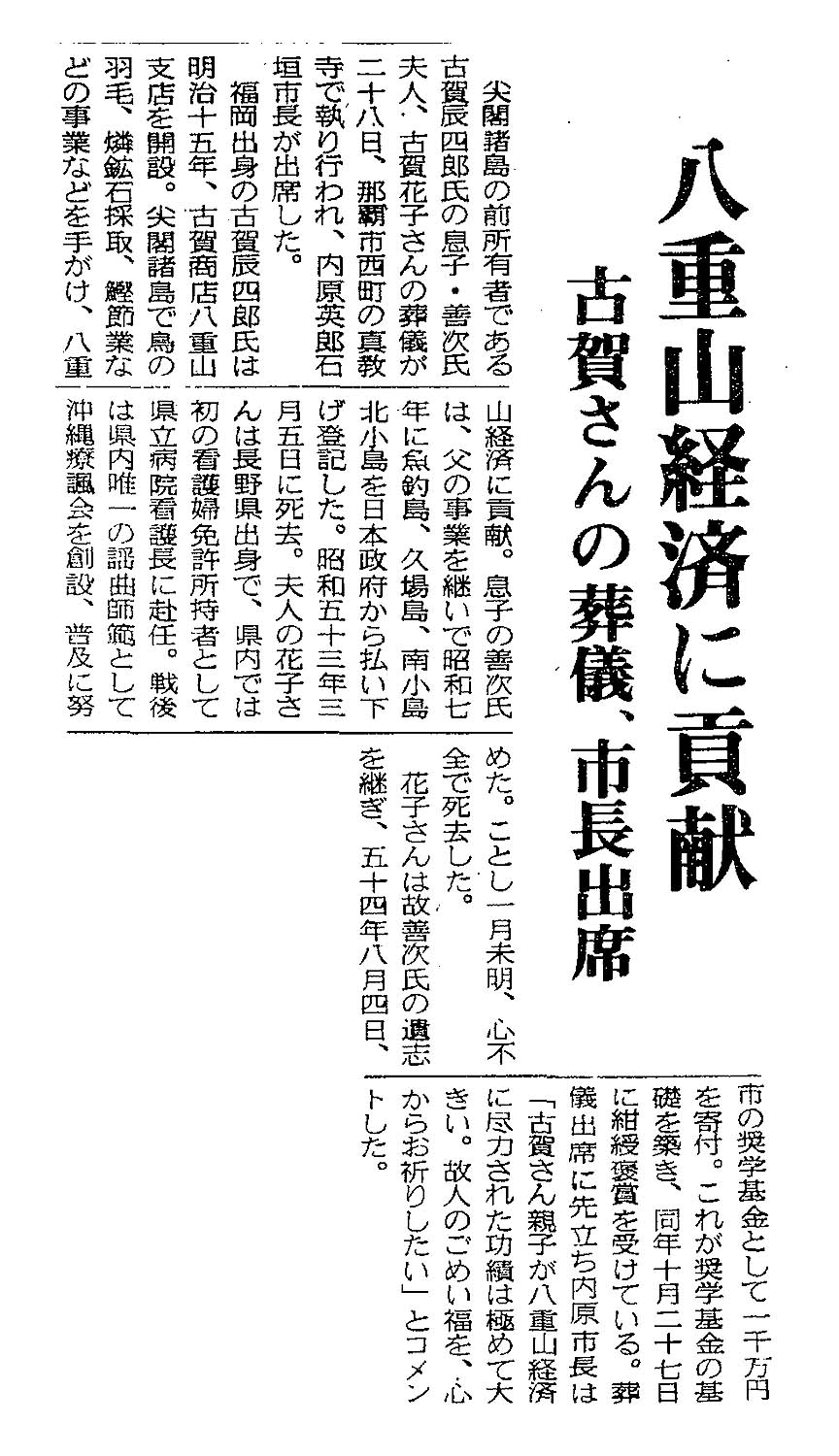 > 八重山経済に貢献/古賀さんの葬儀、市長出席 :