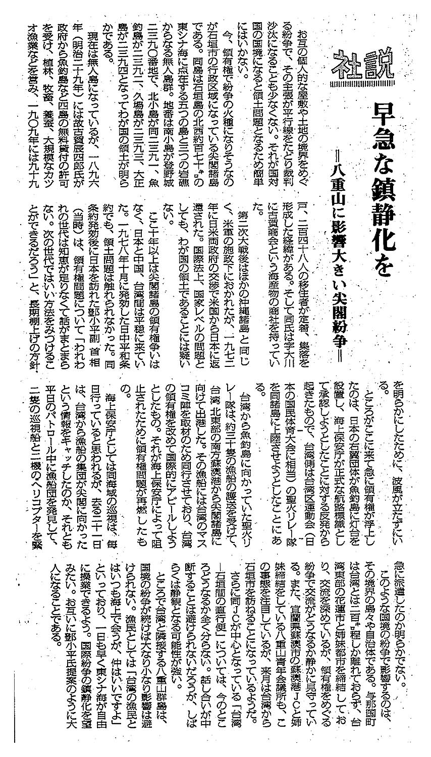> <社説> 早急な鎮静化を/=八重山に影響大きい尖閣紛争=: