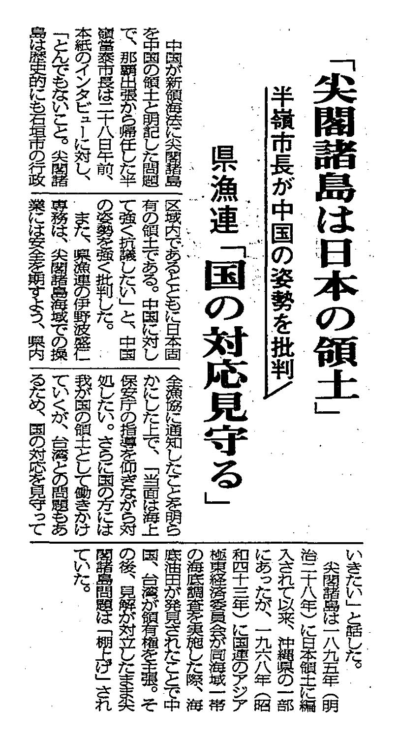 > 「尖閣諸島は日本の領土」/半嶺市長が中国の姿勢を批判/県漁連「国の対応を見守る」: