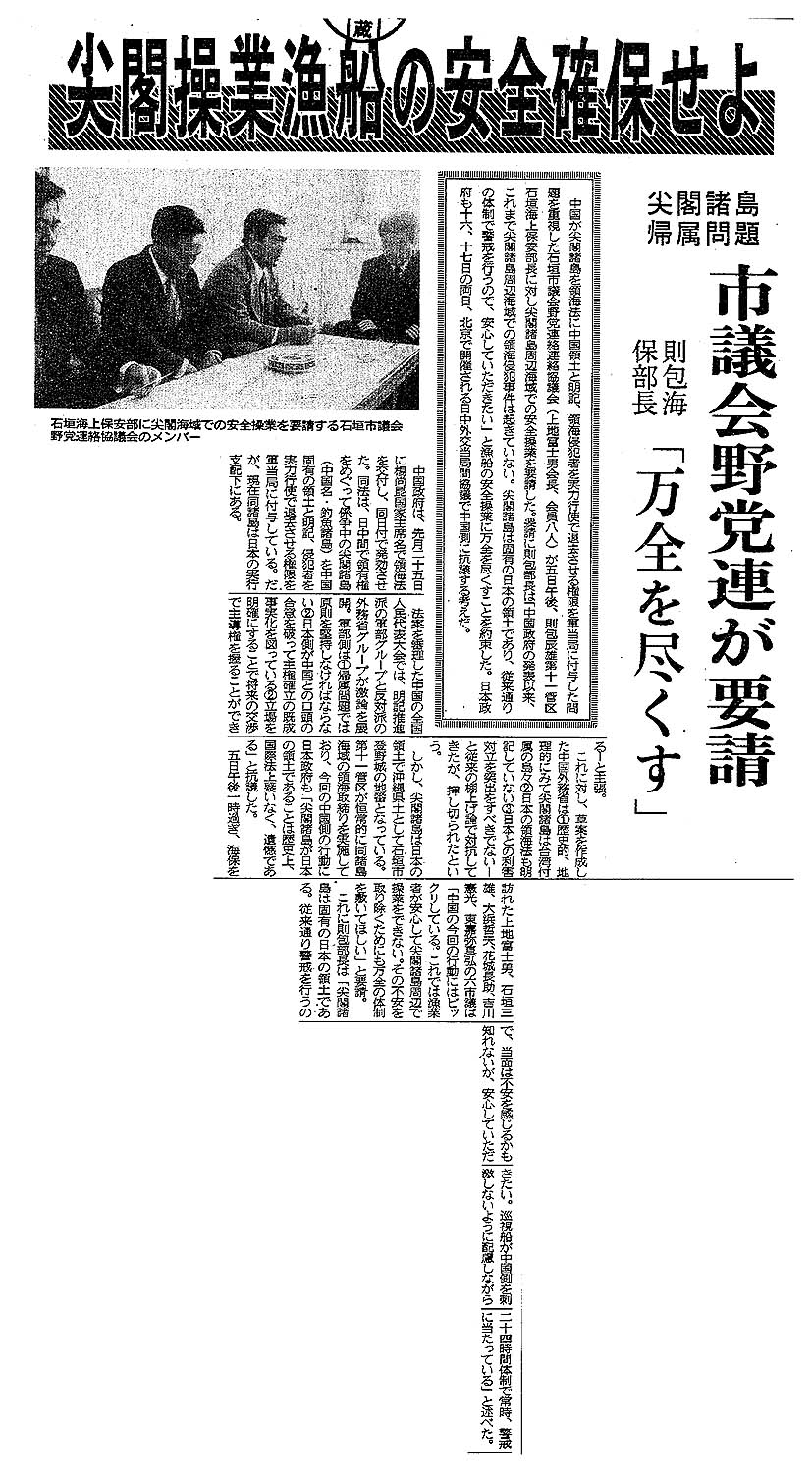> 尖閣操業漁船の安全確保せよ/尖閣諸島帰属問題 市議会野党連が要請/則包海保部長「万全を尽くす」 :