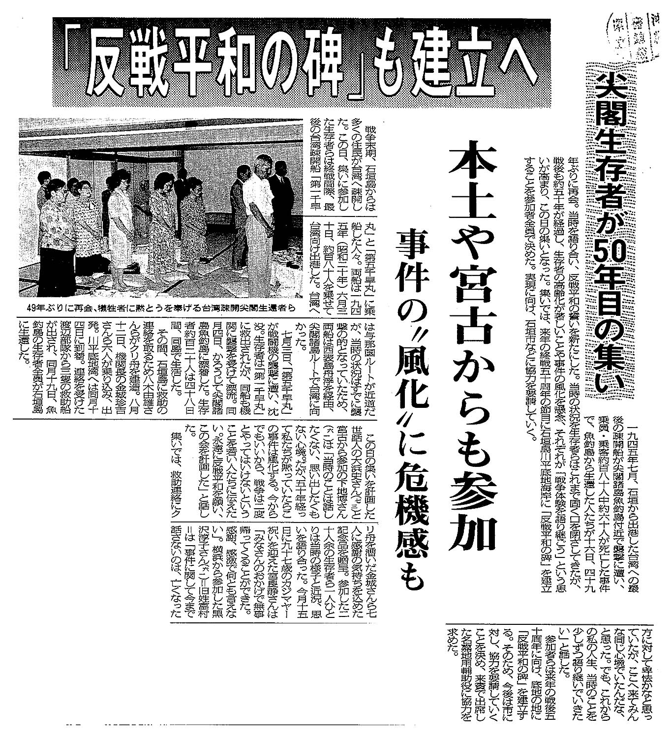 Home > 10年代 > 尖閣生存者が50年目の集い/「反戦平和の碑」も建立へ/本土や宮古からも参加 事件の”風化”に危機感も  :現代仮名遣いテキスト