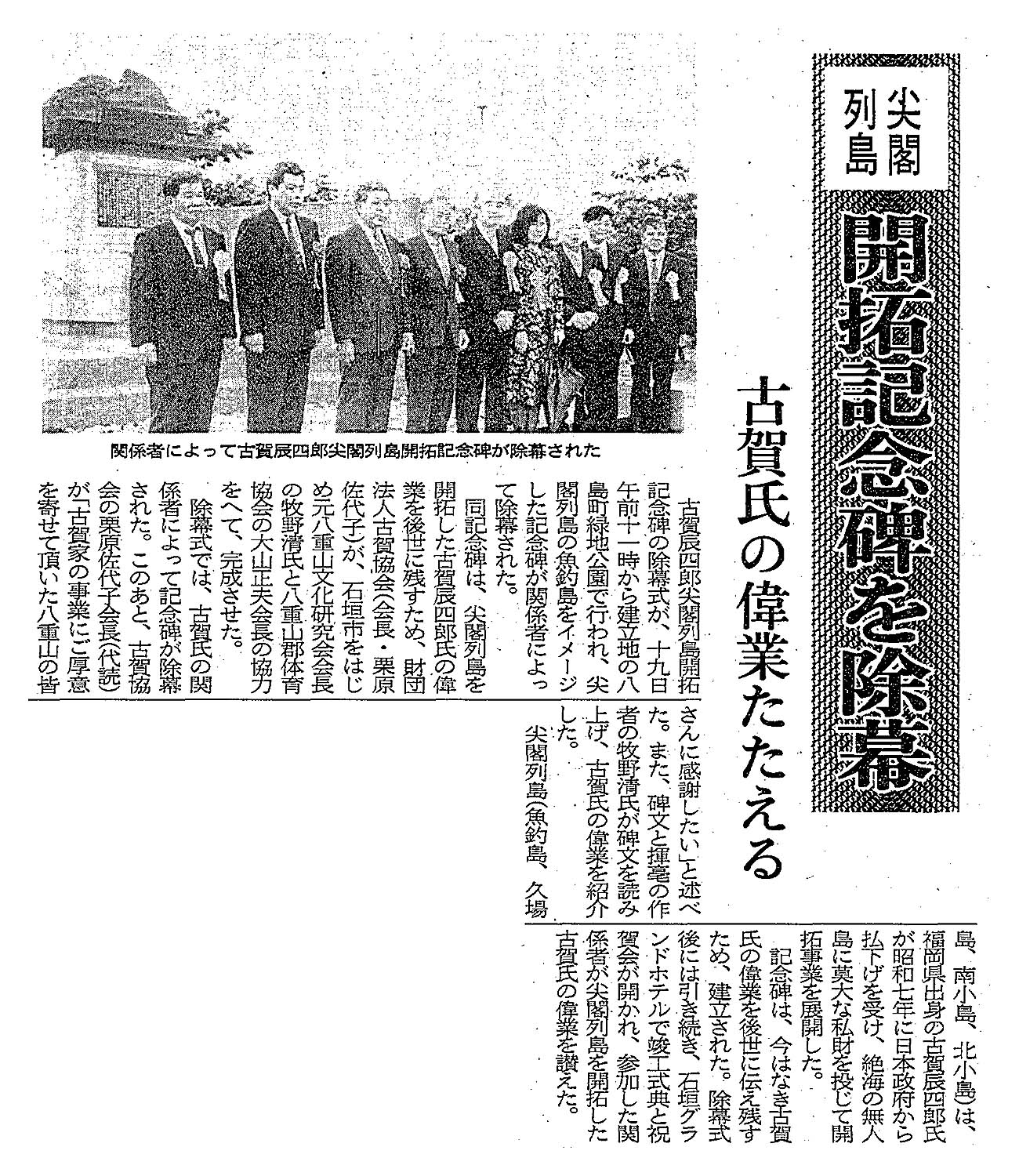 > 尖閣列島 開拓記念碑を除幕/古賀氏の偉業たたえる: