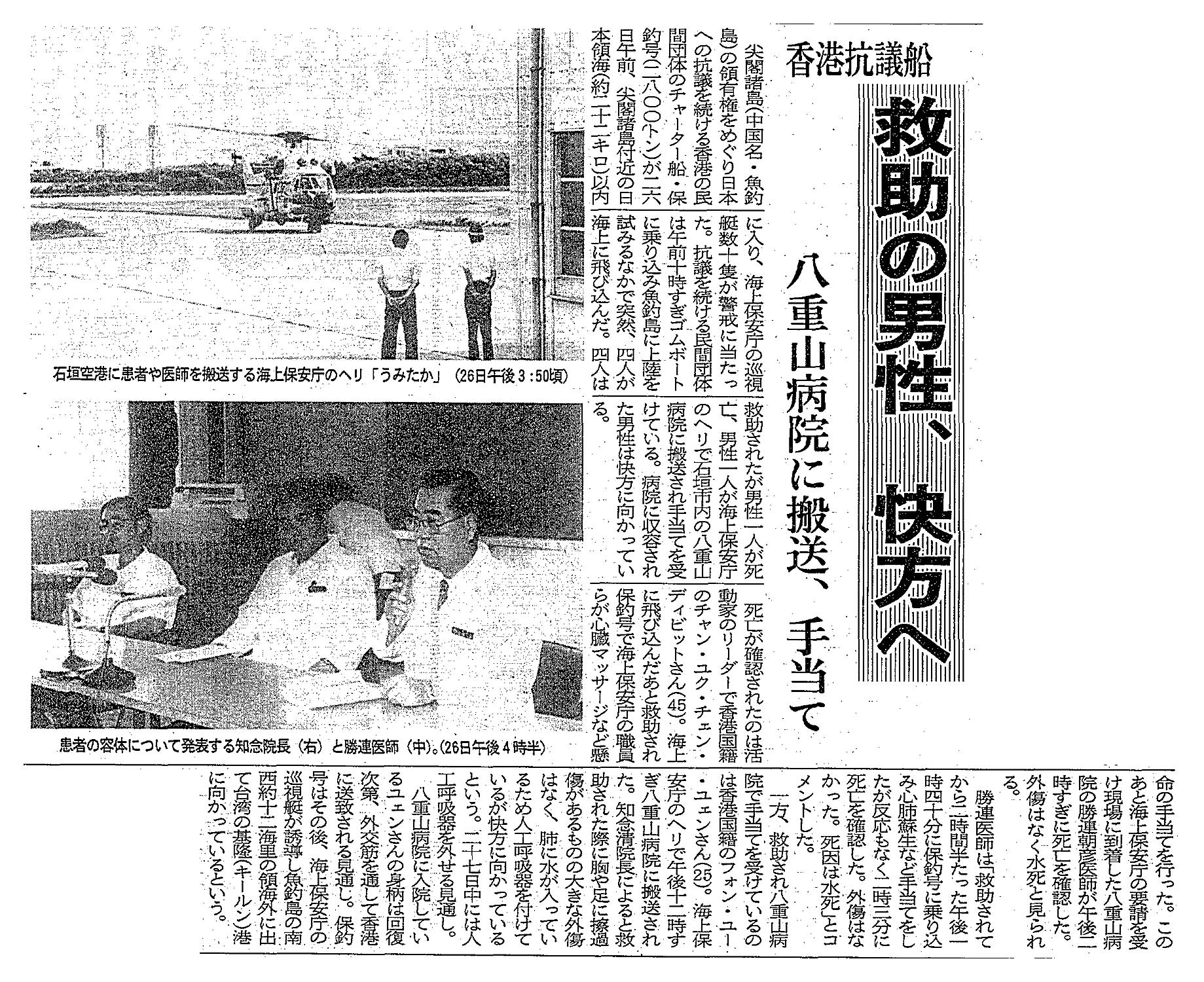 > 尖閣抗議船/救助の男性、快方へ/八重山病院に搬送、手当て: