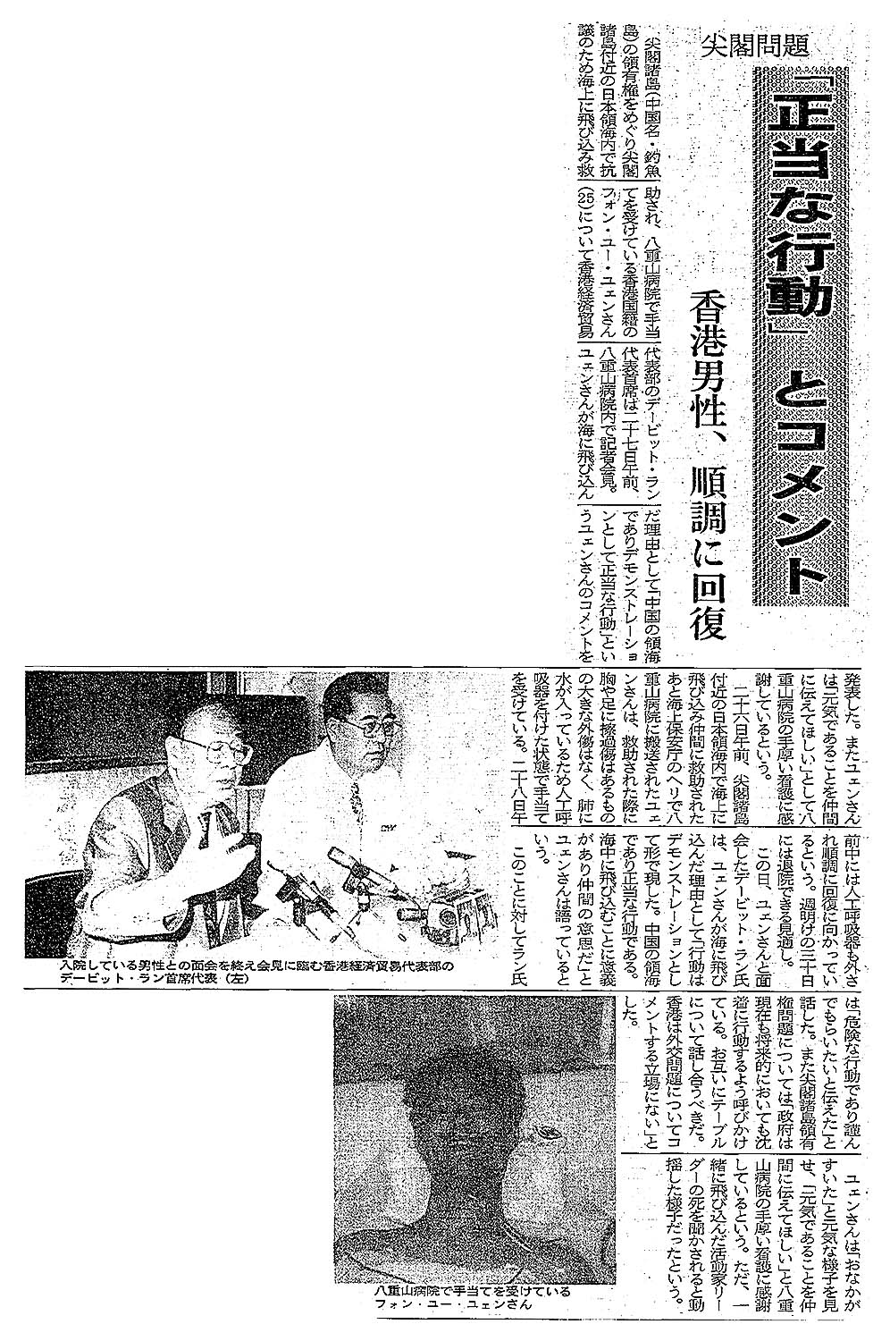 > 尖閣問題/「正当な行動」 とコメント/香港男性、順調に回復: