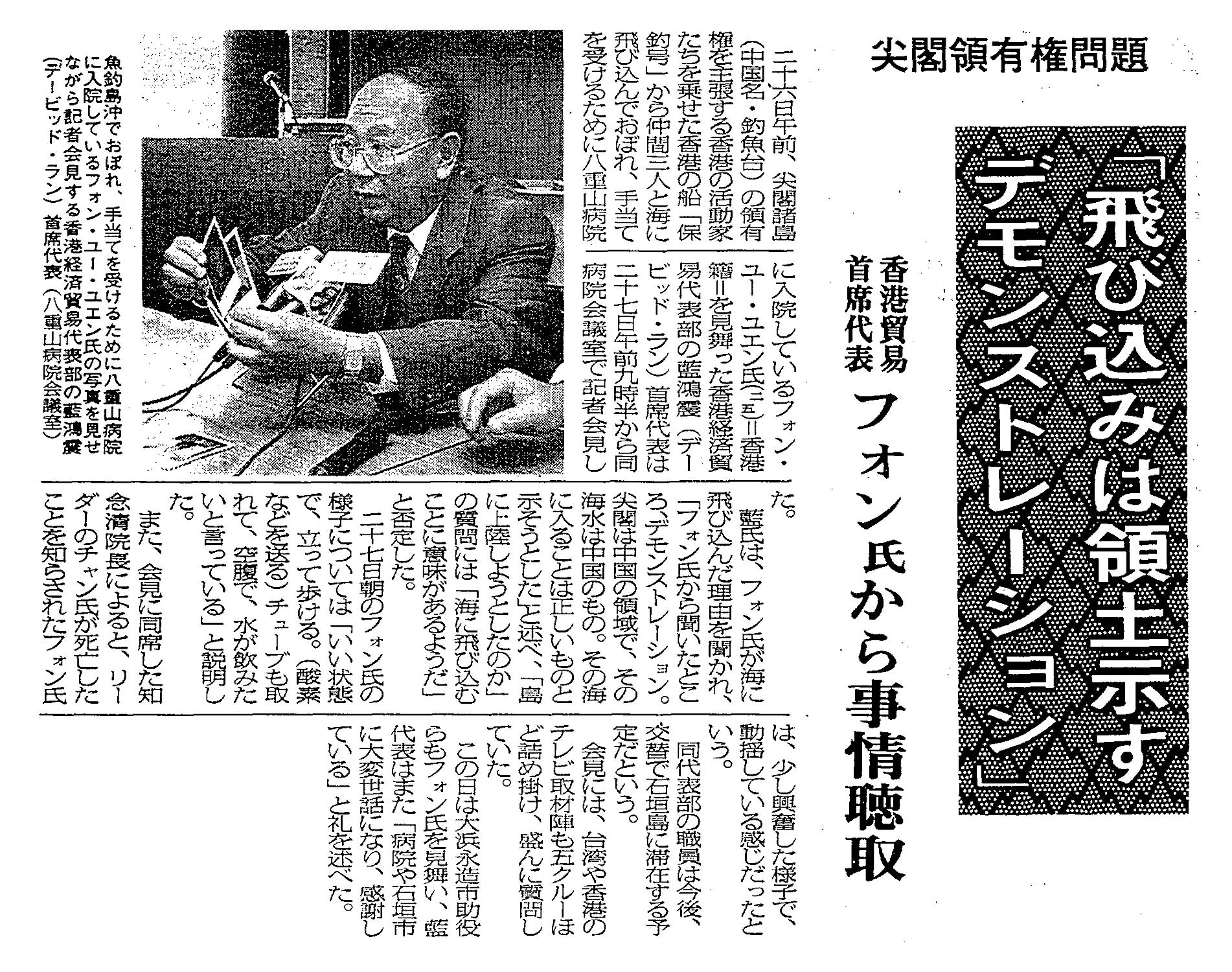 Home > 40年代 > 尖閣領有権問題/「飛び込みは領土示すデモンストレーション」/香港貿易首席代表フォン氏から事情聴取:現代仮名遣いテキスト