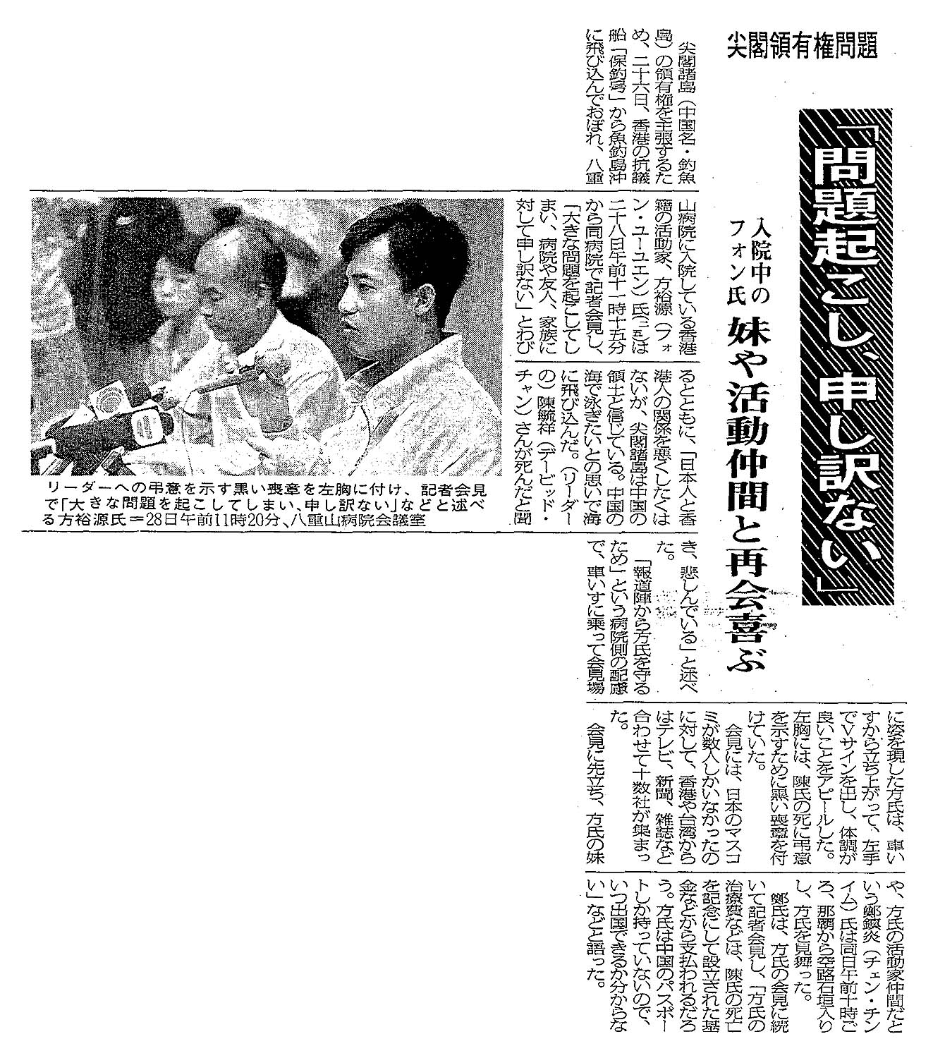 > 尖閣領有権問題/「問題起こし、申し訳ない」/入院中のフォン氏 妹や活動仲間と再会喜ぶ: