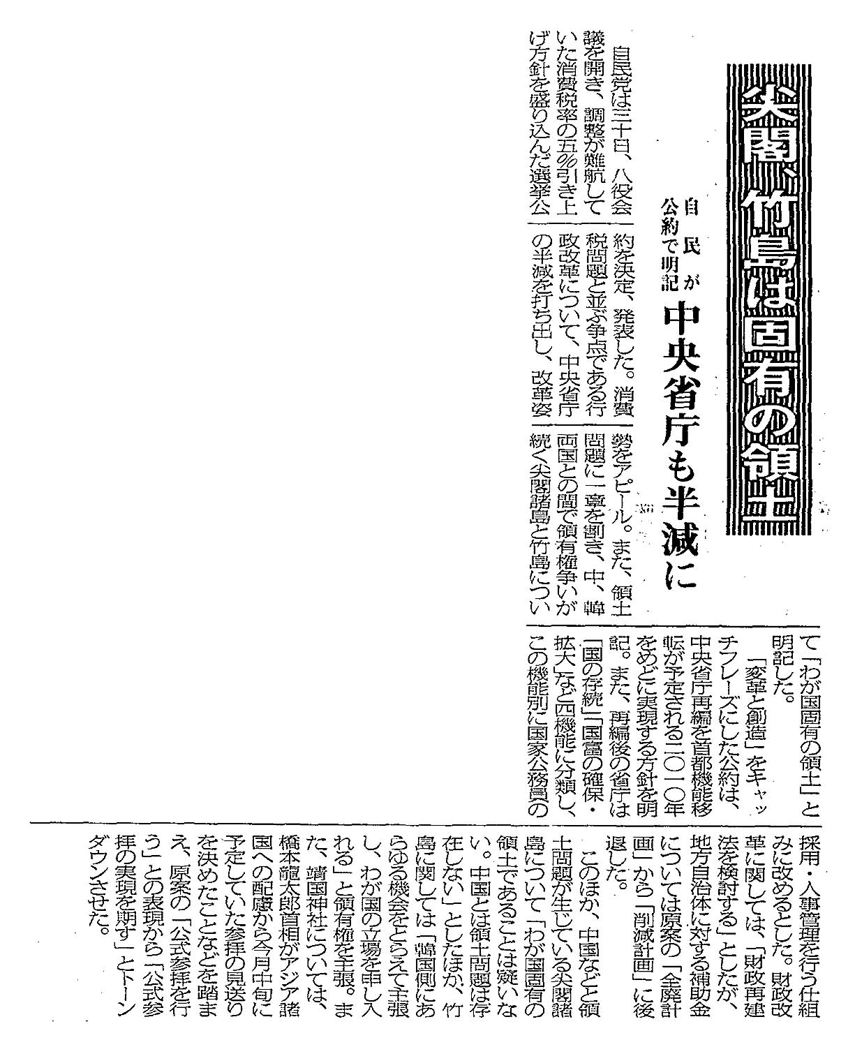 > 尖閣、竹島は固有の領土/自民が公約で明記 中央省庁も半減に:
