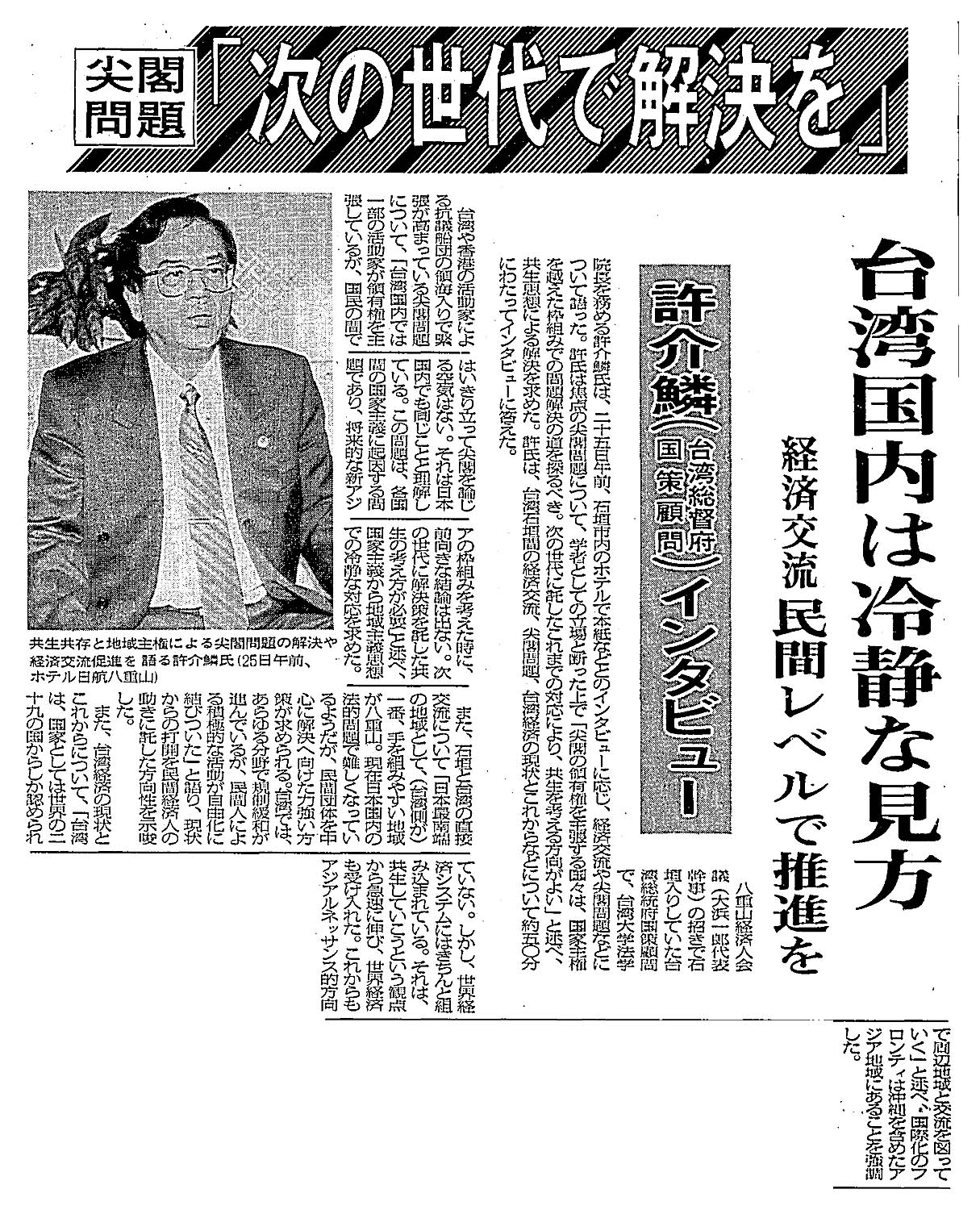 許介鱗インタビュー(台湾総督府国策顧問)/尖閣問題「次の世代で解決を」/台湾国内は冷静は見方/経済交流 民間レベルで推進を 現代仮名遣いテキスト
